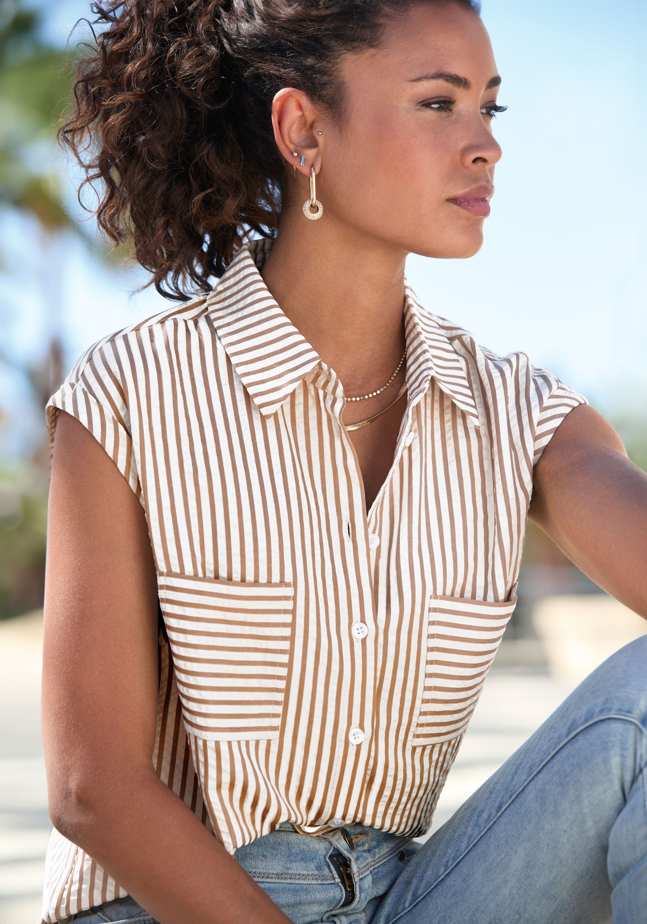 In der Freizeit fungieren Blusen aus Denim auch als leichte Jacke – das dickere Material macht es möglich. Was darunter passt? Beispielsweise ein schlichtes weisses Tanktop. Der Rest lässt sich je nach Anlass von sportlich bis feminin stylen. Im ersten Fall sind Chinos und Sneaker eine prima Ergänzung. Für die zweite Variante können Sie zum Beispiel auf einen sommerlichen geblümten Rock und leichte Boots zurückgreifen.