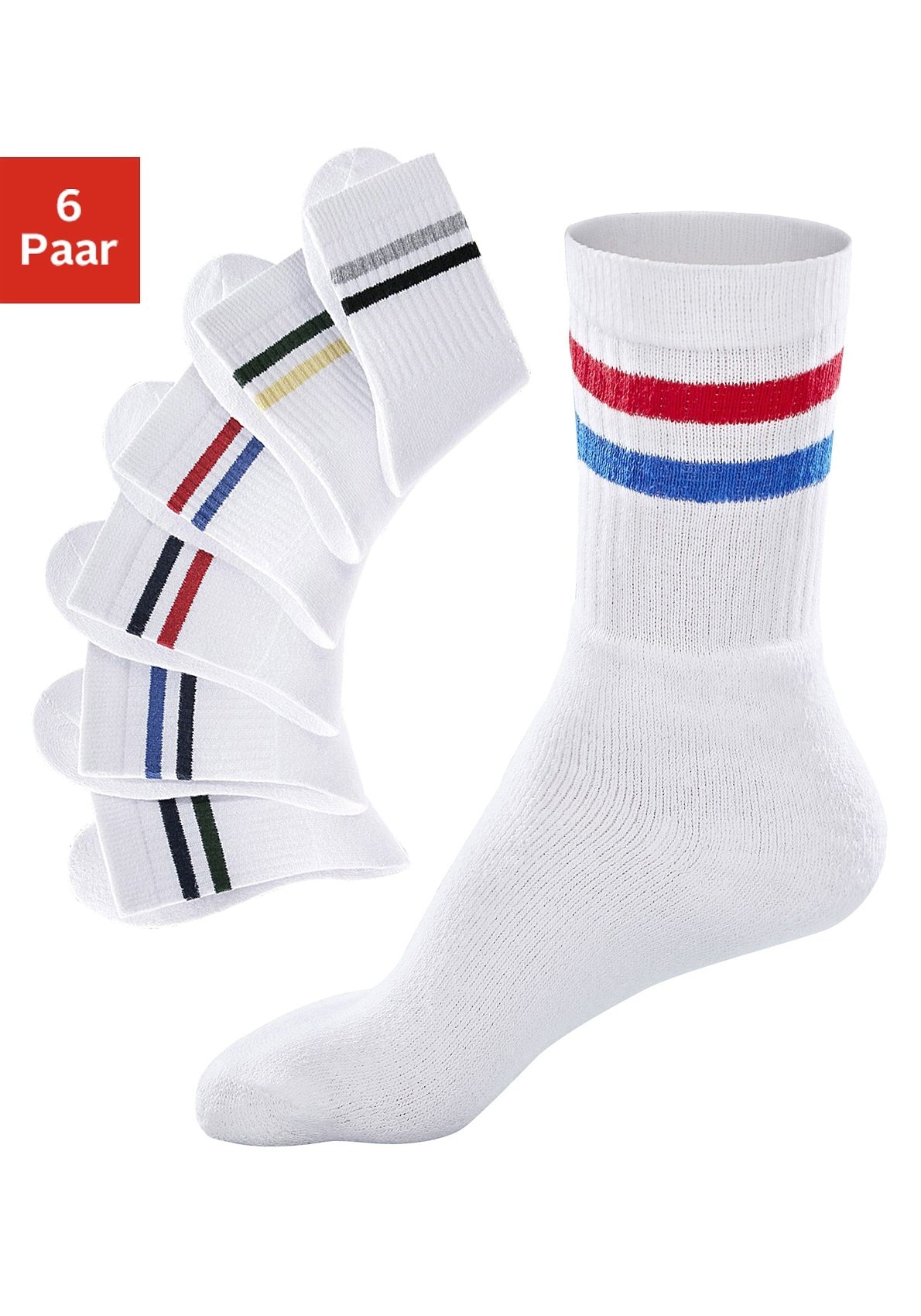 Jetzt bestellen! Vielseitige Basics für jede Gelegenheit. Einfach nach Lust und Laune kombinieren. Basic-Socken für sportlich Aktive! Auch bei hoher Belastung bleibt das Fussklima frisch und die Socke verrutscht nicht. Dank Frotteesohlen und verstärkter Ferse ist dieser Workoutpartner besonders gut gepolstert und bleibt lange so gut wie neu. Das pflegeleichte Material wirkt schweissaufsaugend und hält die Füsse angenehm trocken.Jetzt bestellen: Im sportiven Look mit farbigen Ringeln unter dem Bündchen. Erhältlich als 6er-Pack.Details: Guter Sitz durch Rippenstrukturverstärkte Belastungszonen für optimale Haltbarkeit Vermeidung von Druckstellen durch Frottee Zwei-Faser-QualitätgeringeltMaterial: diverse Faserarten
