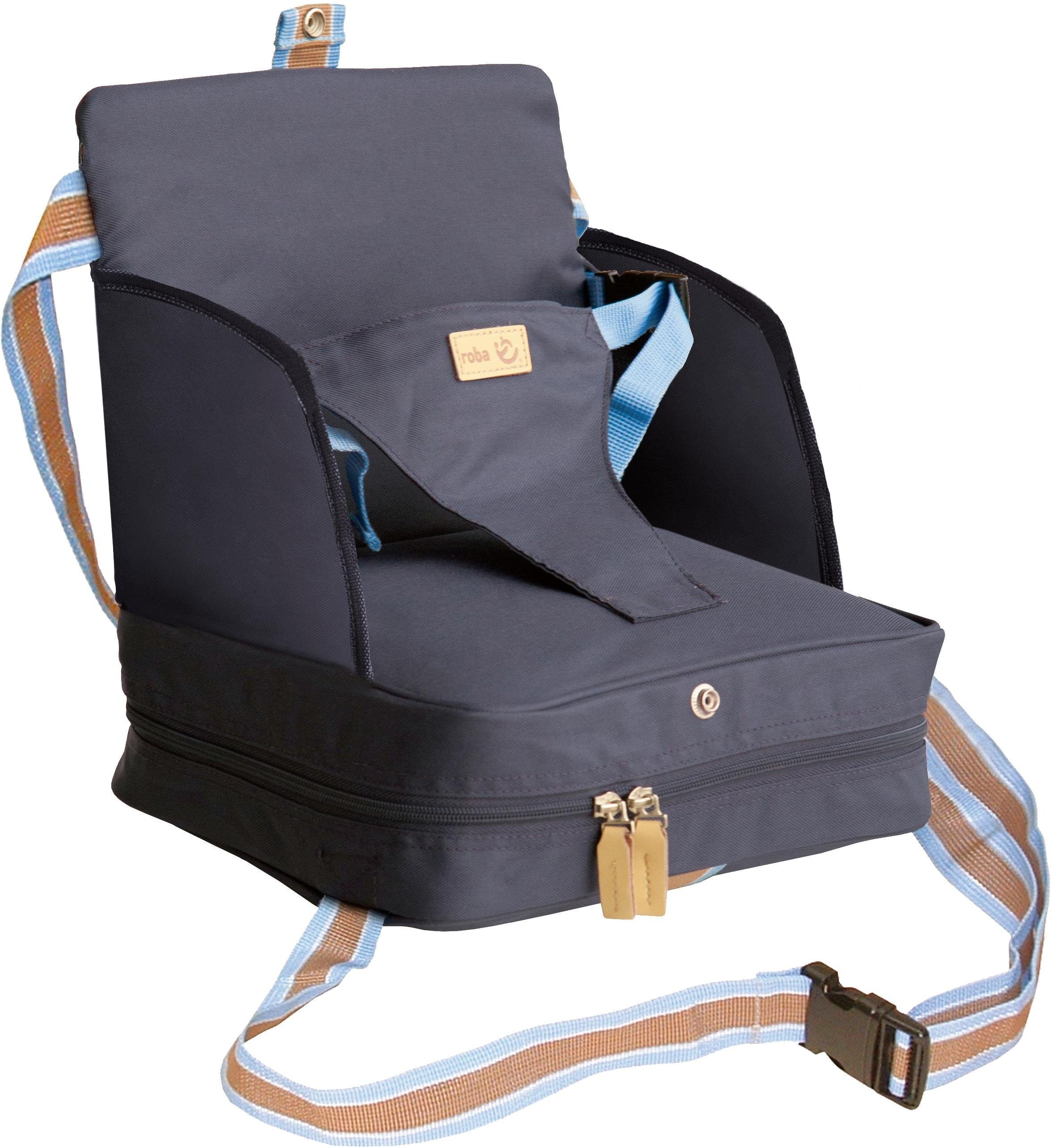 Der roba »Boostersitz« ist der ideale Hochstuhl für unterwegs! Wir haben unseren Topseller, den „aufblasbaren Kindersitz für unterwegs“ jetzt noch sicherer gemacht. Unser neuer »Boostersitz, dunkelblau« bietet noch besseren Sitzkomfort und mit seinen erhöhten und verstärkten Seitenteilen zusätzliche Sicherheit. Mittels der leicht verstellbaren Gurte an der Rückenlehne und unter der Sitzfläche ist der mobile Kindersitz an fast allen gängigen Stühlen schnell und leicht anzubringen. Der mobile Kindersitz ist schnell einsatzbereit und perfekt geeignet fürs Restaurant, bei Grosseltern oder im Urlaub. Der roba »Boostersitz, dunkelblau« sitzt durch Straffziehen der Gurte sicher und ist einfach in der Handhabung. Der breite Bauchgurt der Sitzerhöhung ist an beiden Seiten verstellbar und gewährleistet einen komfortablen und sicheren Halt für Ihr Kind. Die Sitzfläche des roba »Boostersitzes, dunkelblau« besteht aus einem aufblasbaren Kissen, so dass das Baby höher und weich sitzt. Das maximale Belastungsgewicht des Kindersitzes beträgt 15 Kilogramm. Der »Boostersitz, dunkelblau« aus robustem Canvas-Material ist abwaschbar und einfach mit einem feuchten Tuch zu reinigen.
