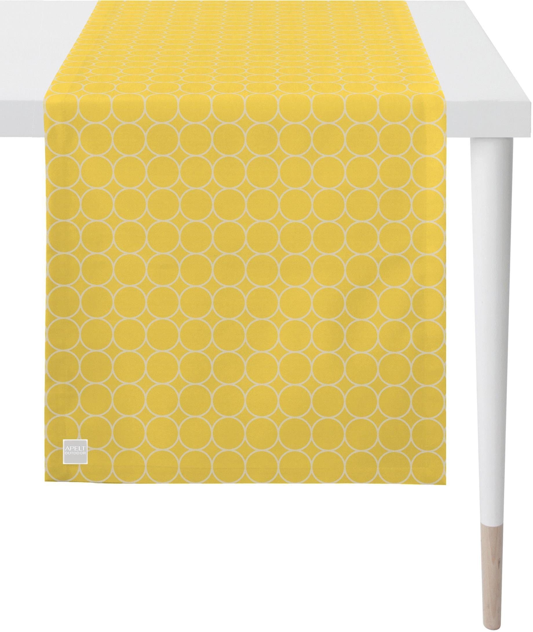 Mit dem Tischläufer »3973 Outdoor« von Apelt wohnt es sich draussen so stilvoll wie drinnen. Das schöne Jacquardgewebe mit modischem Kreismuster ist erstklassig verarbeitet und technisch optimal für den Aussenbereich ausgestattet. Die hochwertige Tischwäsche ist lichtecht, wasserabweisend, atmungsaktiv, besonders strapazierfähig, pflegeleicht und hat dennoch einen angenehmen textilen Griff. Waschbar bei 30°C im Schonwaschgang, feucht aufhängen. Material: 100% Polyester. Mit Fleckschutzausrüstung. Masse ca. 46x135 cm.