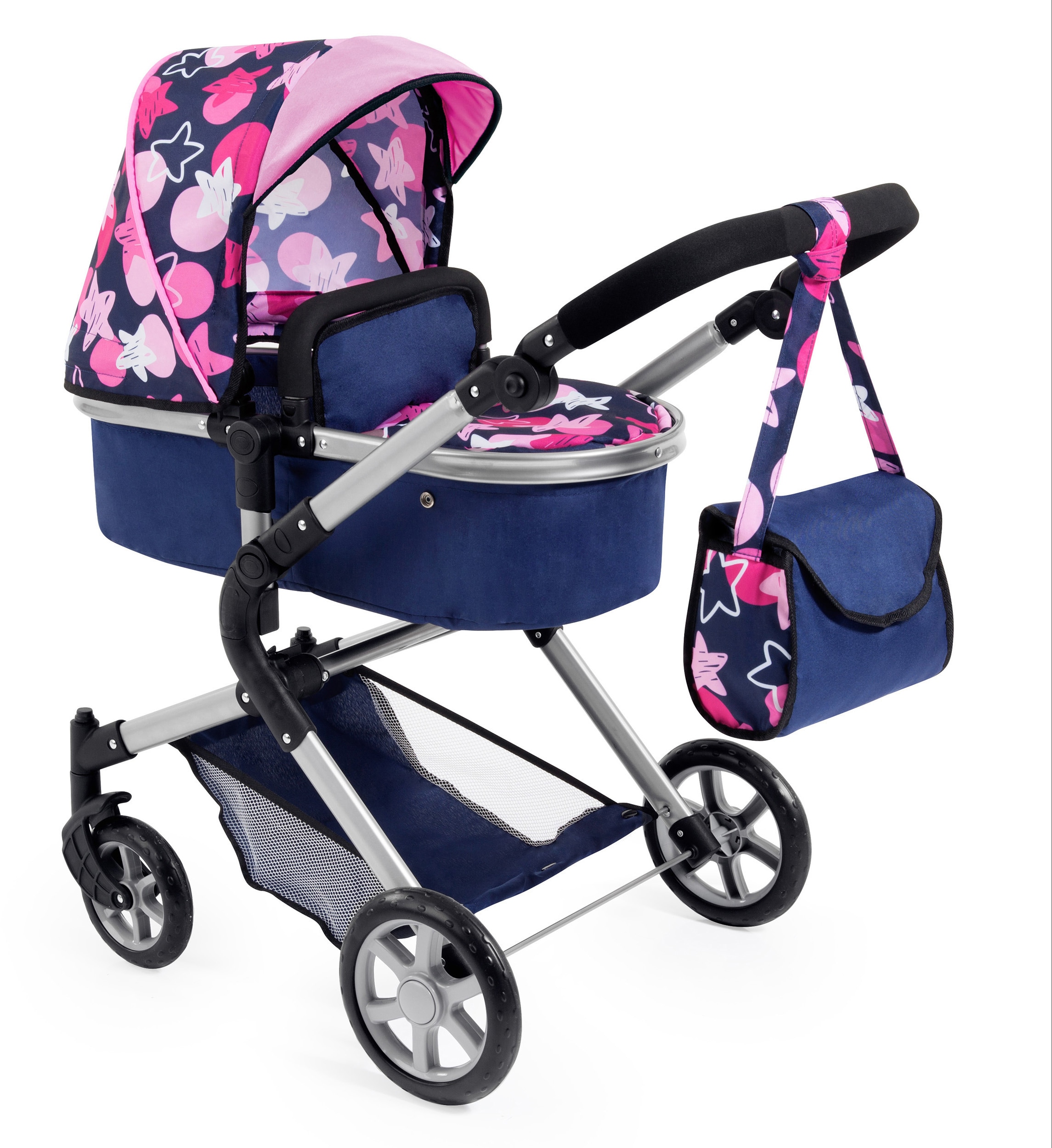 Der Kombi-Kinderwagen für Puppen »City Neo, Blau« von Bayer ist ein moderner Kombi-Puppenwagen mit trendigem Design. Er ist passend für Puppen mit einer Grösse von bis zu 52 cm. Durch seinen höhenverstellbaren Griff kann er optimal auf die entsprechende Kindergrösse angepasst werden. Die Wanne des Wagens kann in Fahrtrichtung als auch in Richtung des Kindes aufgesteckt werden. Zudem kann diese durch Druckknöpfe leicht zu einem Sportsitz umfunktioniert werden. Die schwenkbaren Vorderräder ermöglichen eine besonders leichte Kurvenfahrt. Für den Transport lässt sich der Puppenwagen einfach zusammenklappen. In die mitgelieferte Umhängetasche lassen sich alle wichtigen Puppenutensilien verstauen. Er ist geeignet für Kinder ab 3 Jahren. Der Puppenwagen »City Neo, Blau« ist die optimale Wahl für alle kleinen Puppeneltern.