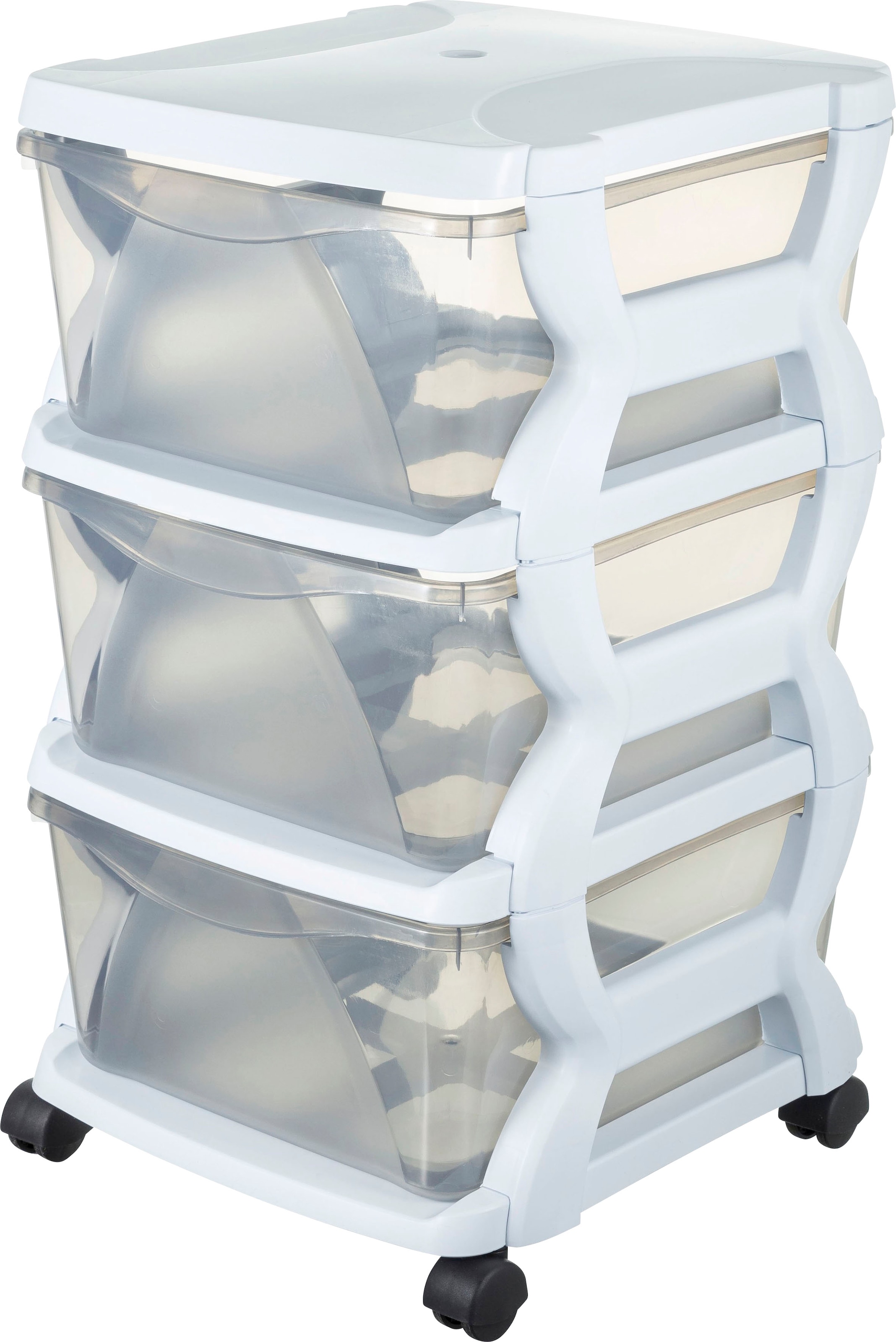 Vielseitig einsetzbar: Der Rollwagen im modernen Design bietet reichlich Stauraum. Der Rollcontainer aus hochwertigem Kunststoff ist mit mehreren übereinander angeordneten Aufbewahrungsboxen mit je 43,8 l Fassungsvermögen ausgestattet. Dank der Rollen lässt sich der Wagen leicht von Raum zu Raum bewegen. Wahlweise lässt er sich als Aufbewahrungsmöglichkeit für Konserven und Küchenutensilien in der Küche, als flexibel einsetzbares Badezimmermöbel oder zur Aufbewahrung von Spielzeug im Kinderzimmer verwenden.