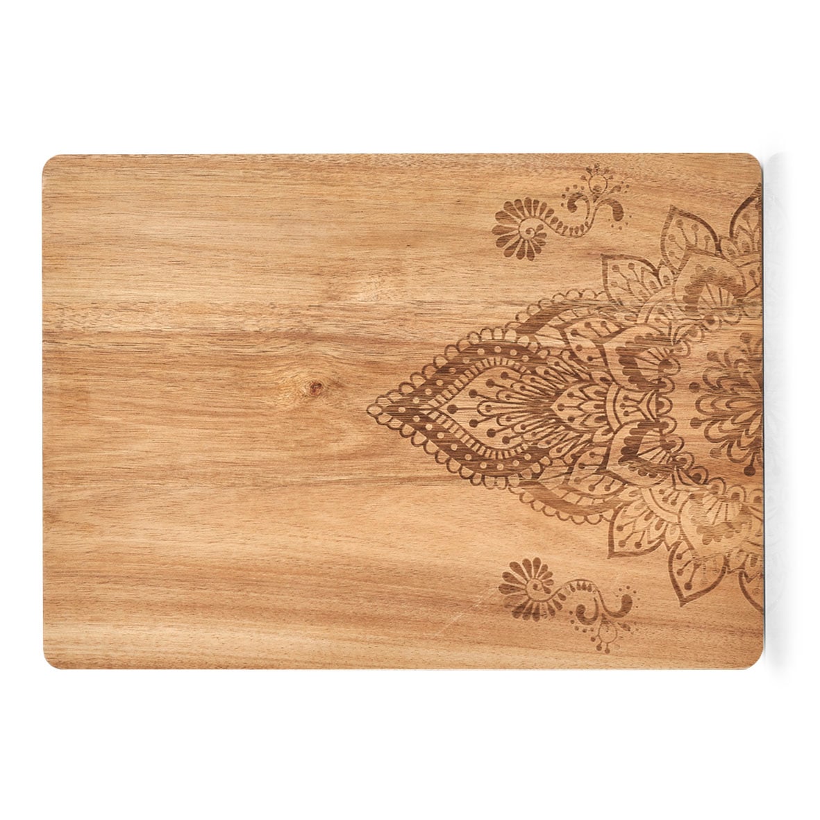 Dieses eckige Schneidebrett eignet sich nicht nur zum Zubereiten von Lebensmitteln, das schöne, filigrane Muster im Orient-Style macht das Brett zu einem absoluten Hingucker in deiner Küche. Die Henna-ähnliche Musterung wurde in das geölte Akazienholz eingebrannt. DeineLebensmittel können auf diesem Brett gleichzeitig zubereitet und serviert werden