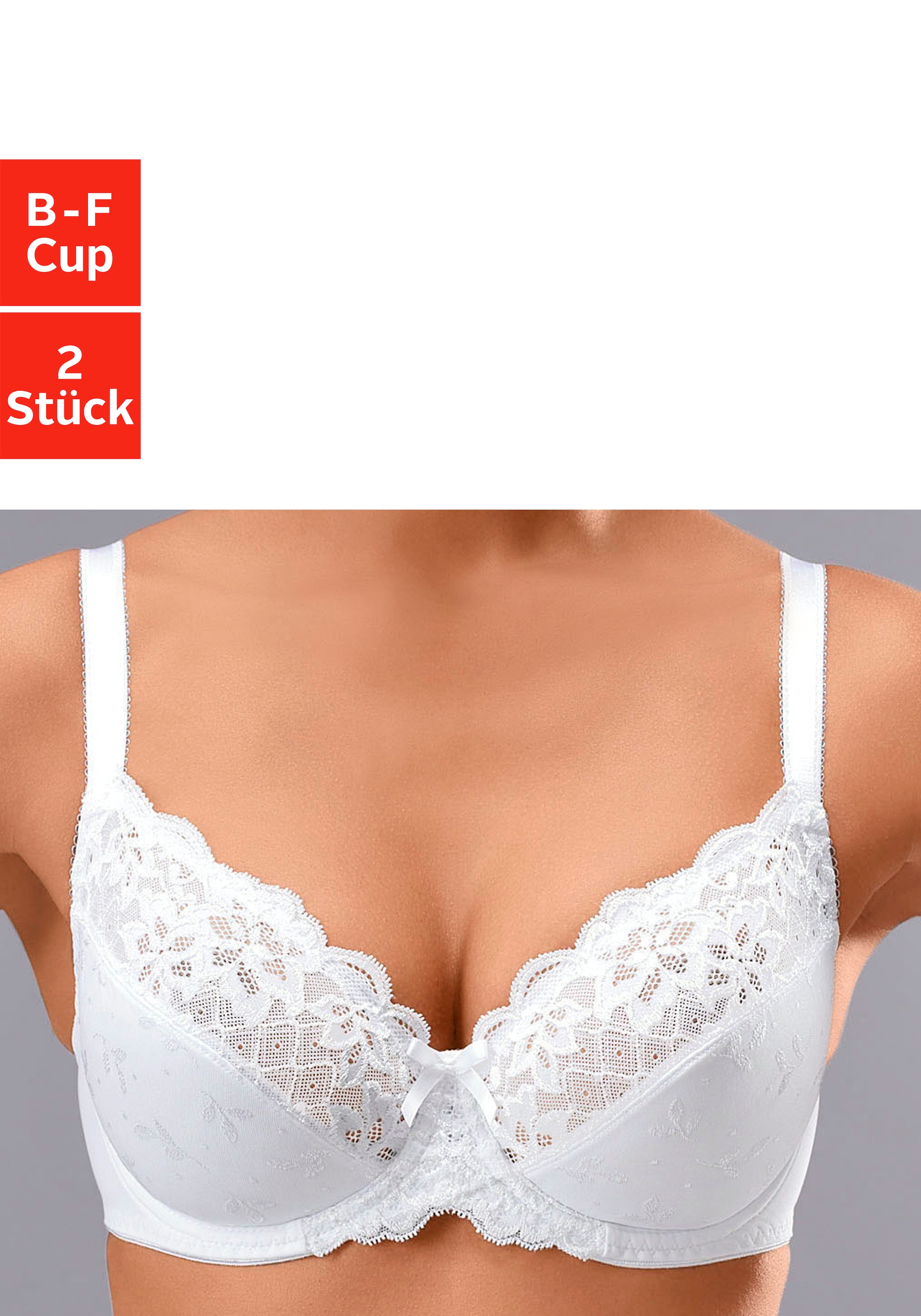 Im Doppelpack: Bügel-BH von wäschepur. Mit zweigeteilten Cups und leicht transparentem Tülleinsatz an den Obercups, der bis in die im Rücken verstellbaren Träger verläuft. Modischer Druck und kontrastfarbige Zierschleife. 84% Polyamid, 16% Elasthan.