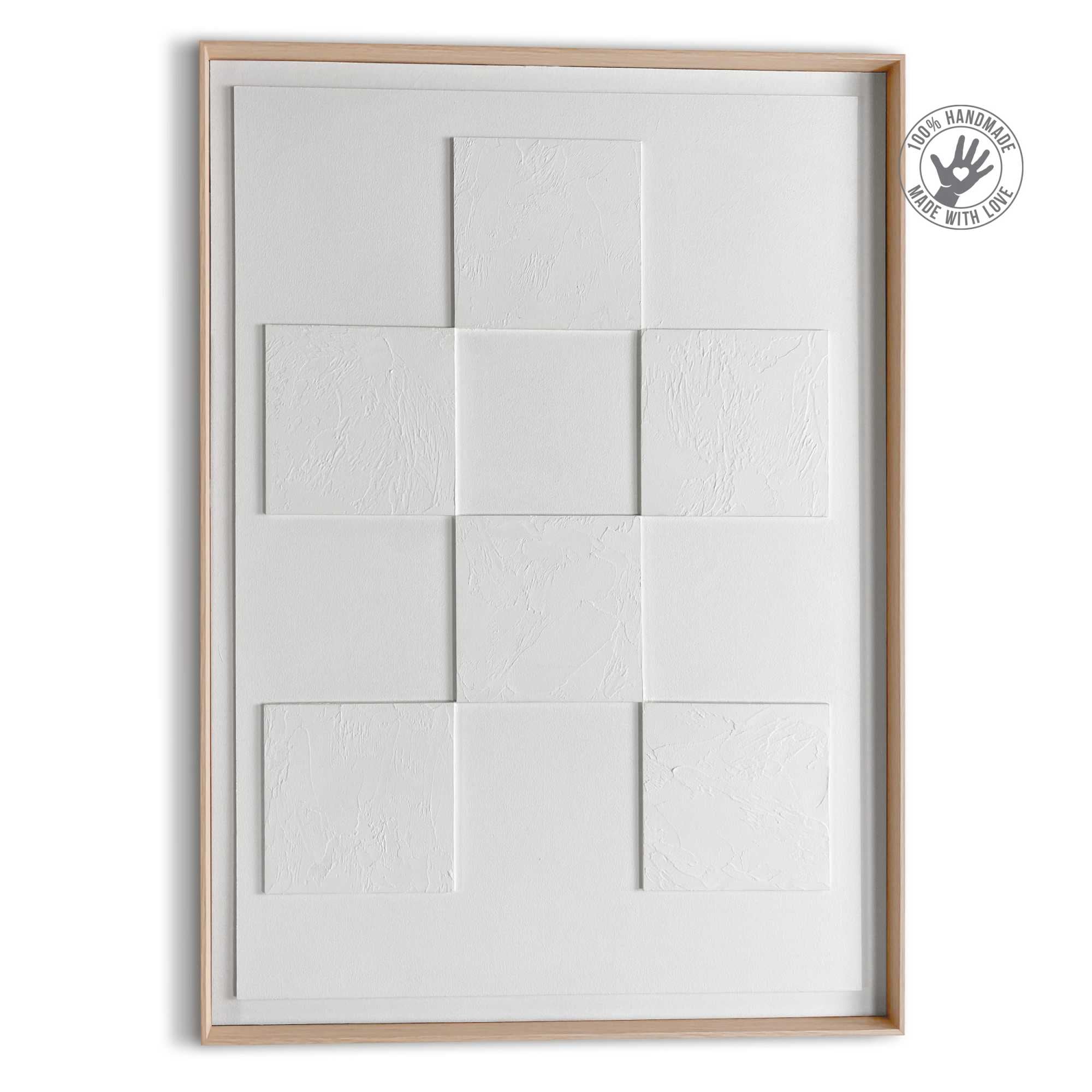 Handgefertigter Wanddeko mit abstraktem Relief in weissem Gips, eingerahmt von einem Holzrahmen. Der skandinavische Minimalismus mit 3d-Textur passt zu den meisten modernen Wohnstilen wie Basic, Vintage, Urban oder Industrial.