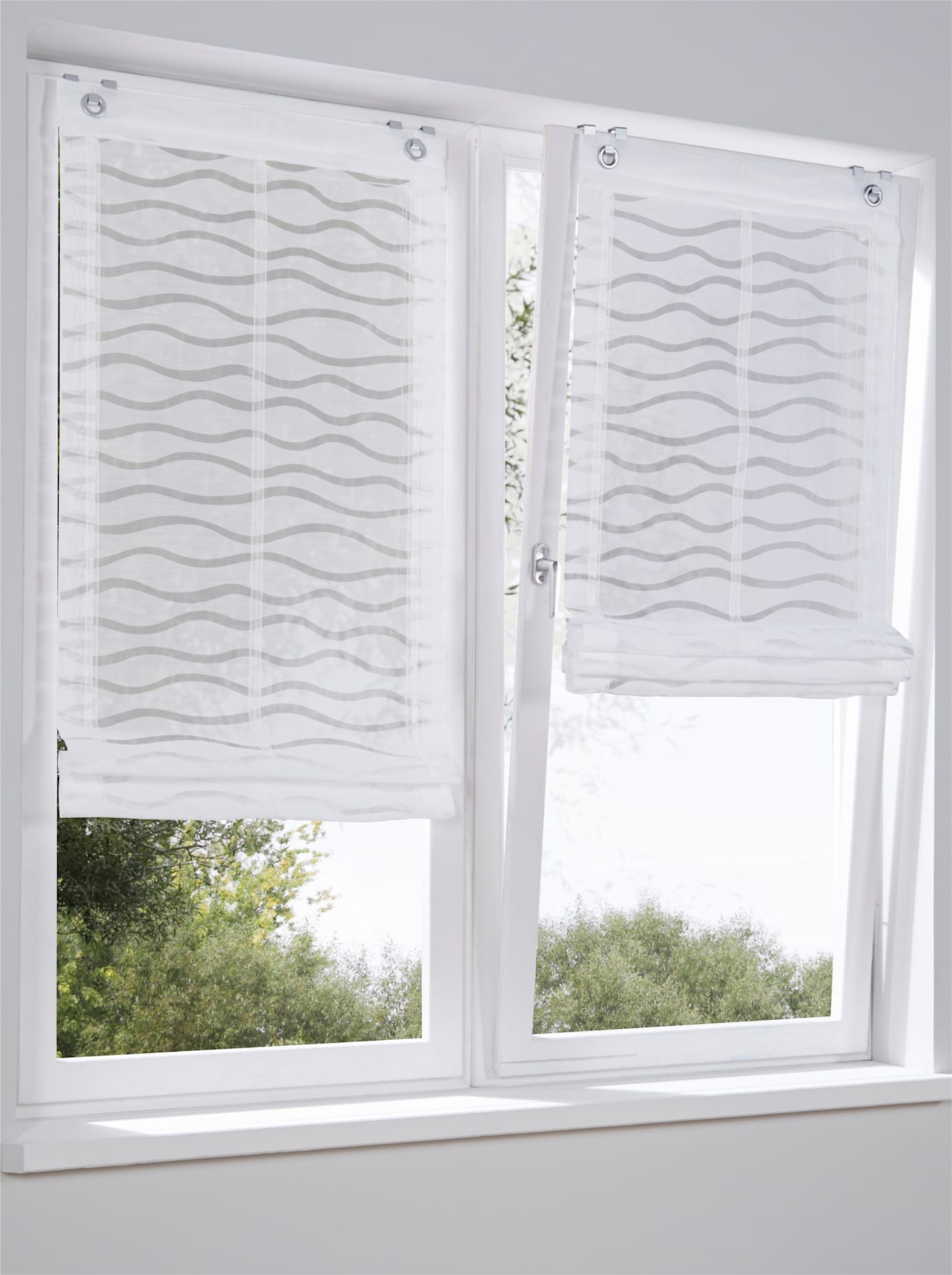 Raffrollo Halbtransparenter Ausbrenner mit Wellen-Dessin. Oben und unten mit Beschwerungsstange. Inkl. Haken. Tipps zum richtigen Massnehmen online. 65% Baumwolle, 35% Polyester. Waschbar.