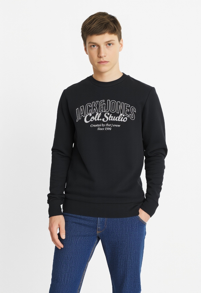 Modisches Jungen-Kapuzensweatshirt der Marke Jack & Jones Junior. Mit einem normalen Schnitt. Die Ärmel sind lang. Es ist mit einem lässigen Print versehen. Dank des angerauten Sweatstoffs ist das Oberteil angenehm zu tragen.