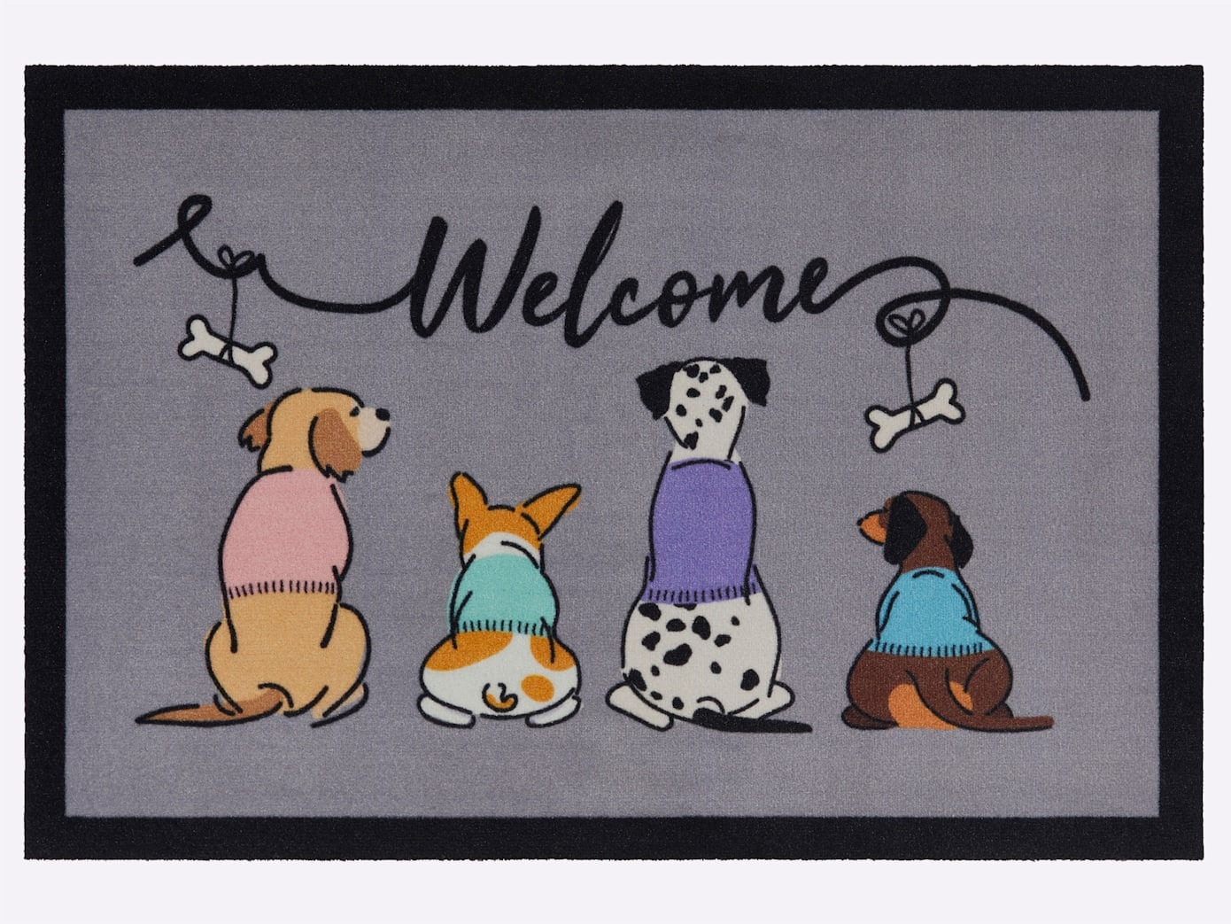 Fröhlich begrüsst diese witzige Meute Ihre Gäste: Fussmatte mit Comic-Motiven. Rutschhemmender Latex-Rücken. 100% Polyamid. Schonwäsche bis 30 °C.