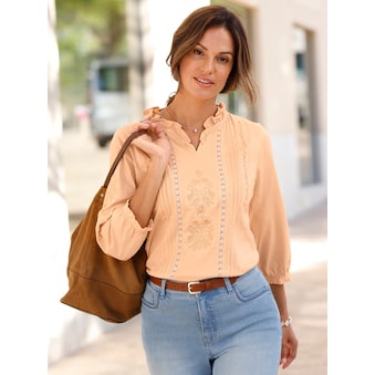 Unkomplizierte Shirtbluse für Frauen von TOM TAILOR mit aufgedruckten Highlights. Mit einem taillenbedeckenden und normalen Schnitt. Die Ärmel sind 3/4-lang. Das Oberteil ist durch die Webstoff-Qualität pflegeleicht.