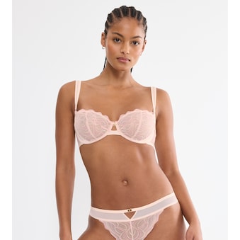 Dieser verführerische String mit geringer Bedeckung sorgt für ein leichtes Tragegefühl und strahlt dank zarter, subtil glänzender italienischer Spitze pure Weiblichkeit aus. Schlüsselloch-Details und goldfarbene Ringe kreieren einen eleganten Kontrast und verleihen dem String einen verspielten, raffinierten Look.