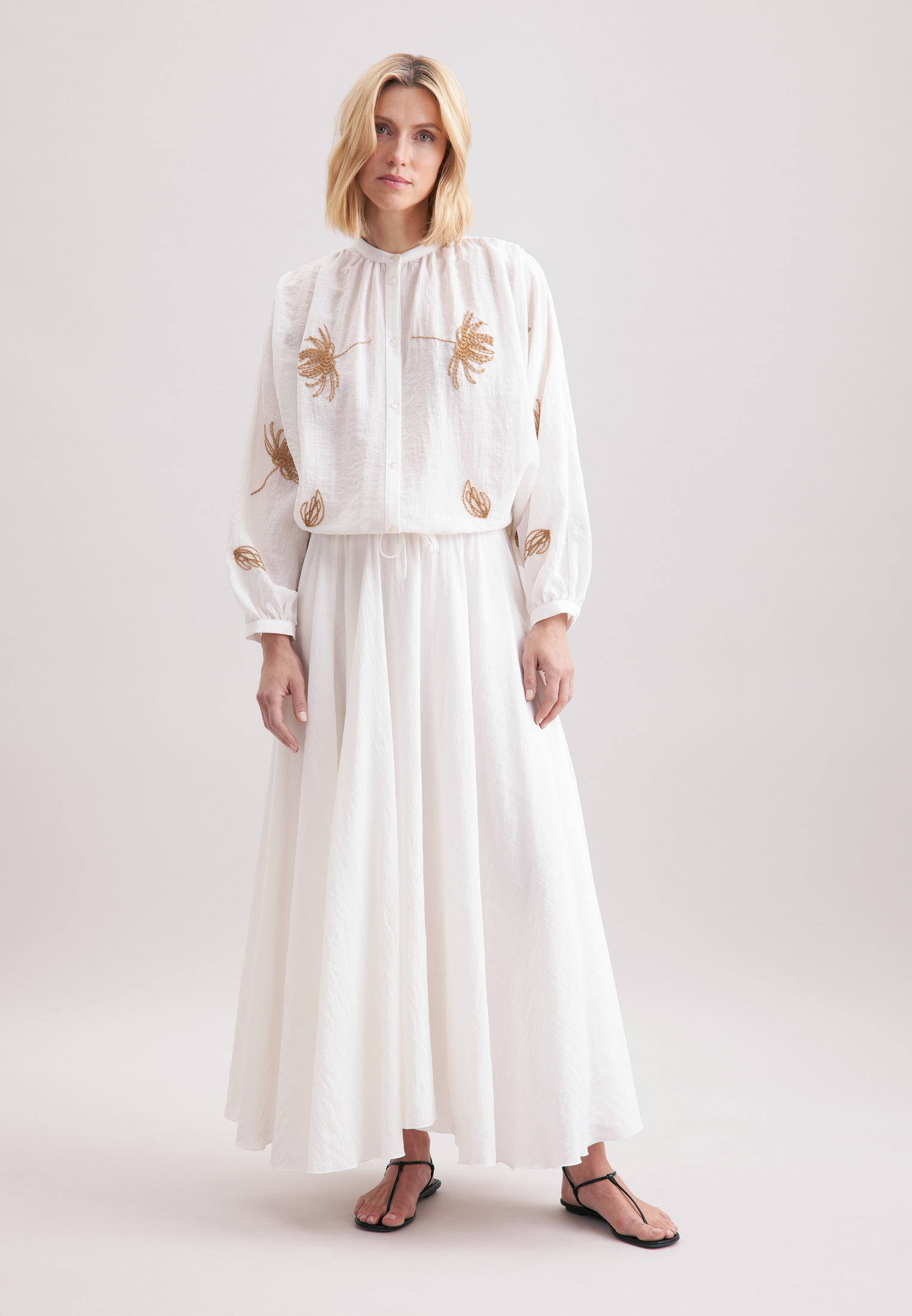 Tunika aus weichem, dezent strukturiertem Musselin. Charakteristisch sind der V-Schlitz mit markanter Blende sowie die 3/4-langen Ärmel mit weitenverstellbaren Manschetten. Der gerade Saum endet mit bequemen Seitenschlitzen.