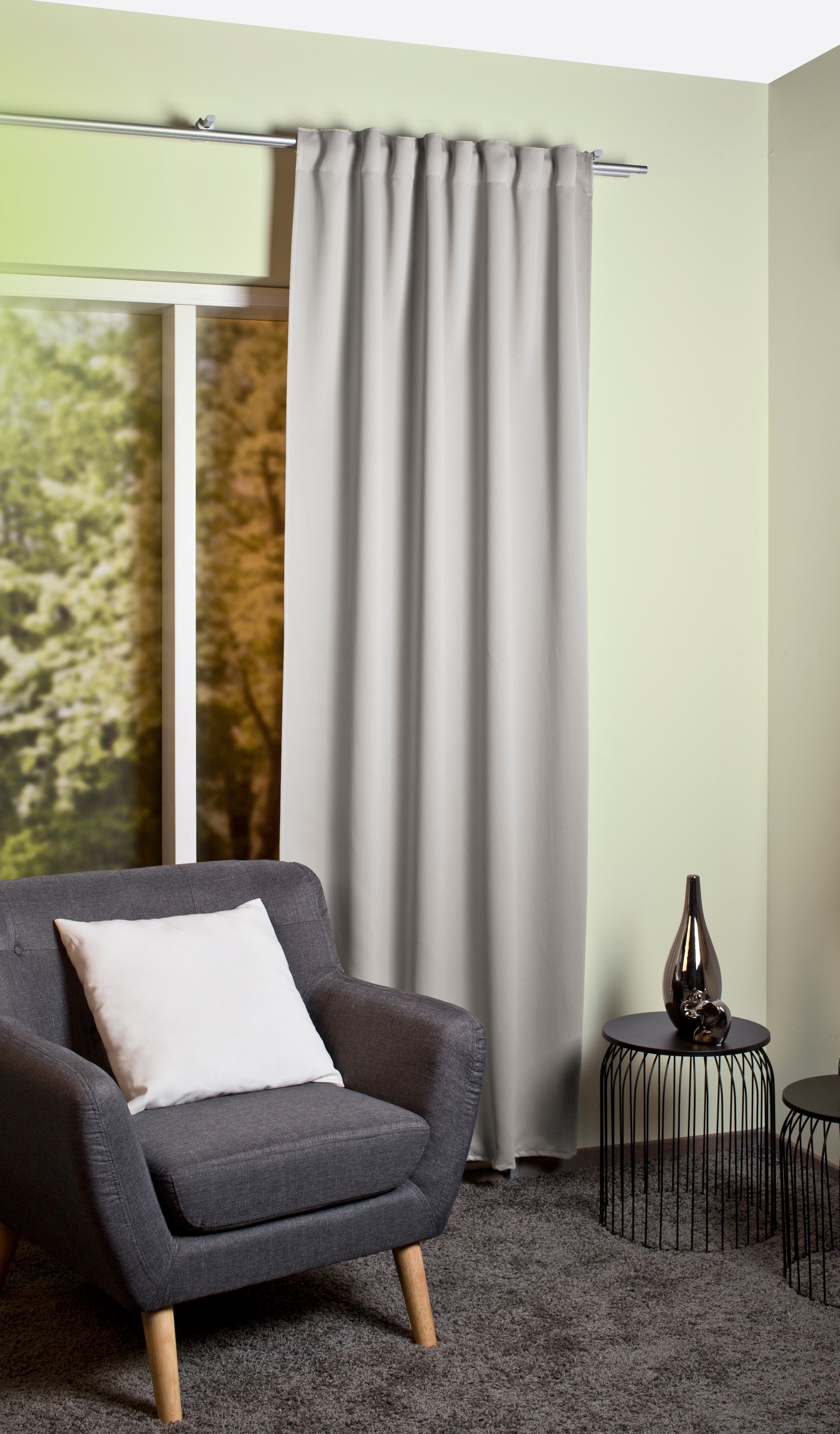 Hinweis Aufhängung | Montageart 1: Aufhängung mittels Gardinenröllchen (nicht im Lieferumfang enthalten) in der Gardinenschiene. Montageart 2: Aufhängung mittels verdeckter Schlaufen an der Gardinenstange. |