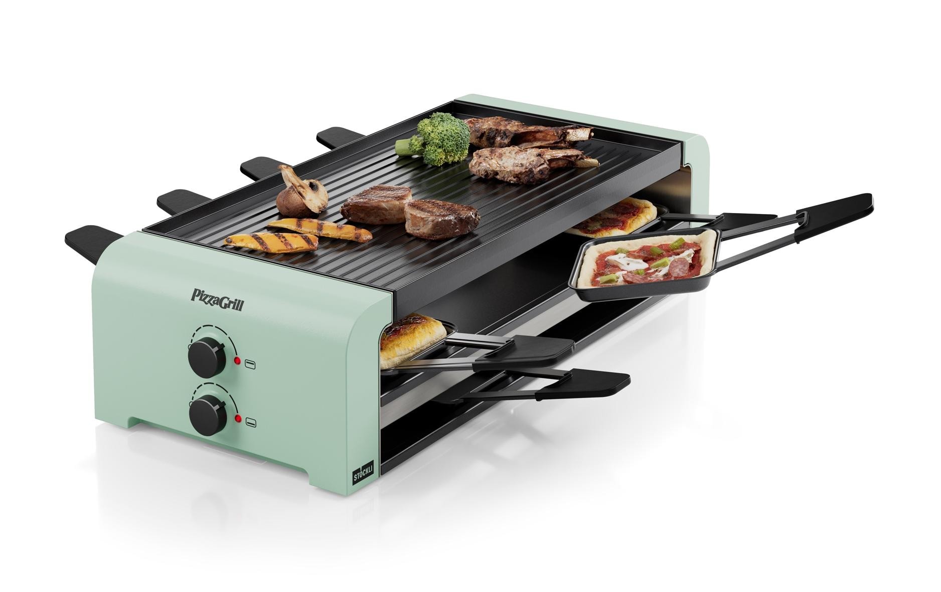 Stöckli PizzaGrill 8 8 Personen. Acht antihaftversiegelte Pfännchen bieten die perfekte Grundlage für vielfältige Genussmomente von deftig bis süss. Acht robuste, kratzfeste Kunststoffspachtel ermöglichen eine schonende und sichere Nutzung der beschichteten Flächen. Der perfekte Begleiter für kulinarische Abende für bis zu acht Personen.