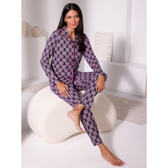 Pyjama von wäschepur mit üppig bedrucktem Oberteil und einfarbiger Dehnbund-Hose. Langarm-Oberteil mit feiner Paspelierung um den Reverskragen und entlang der Knopfleiste. Geschmeidige Single-Jersey-Qualität aus Viskose-Stretch-Mischung. 95% Viskose, 5% Elasthan.