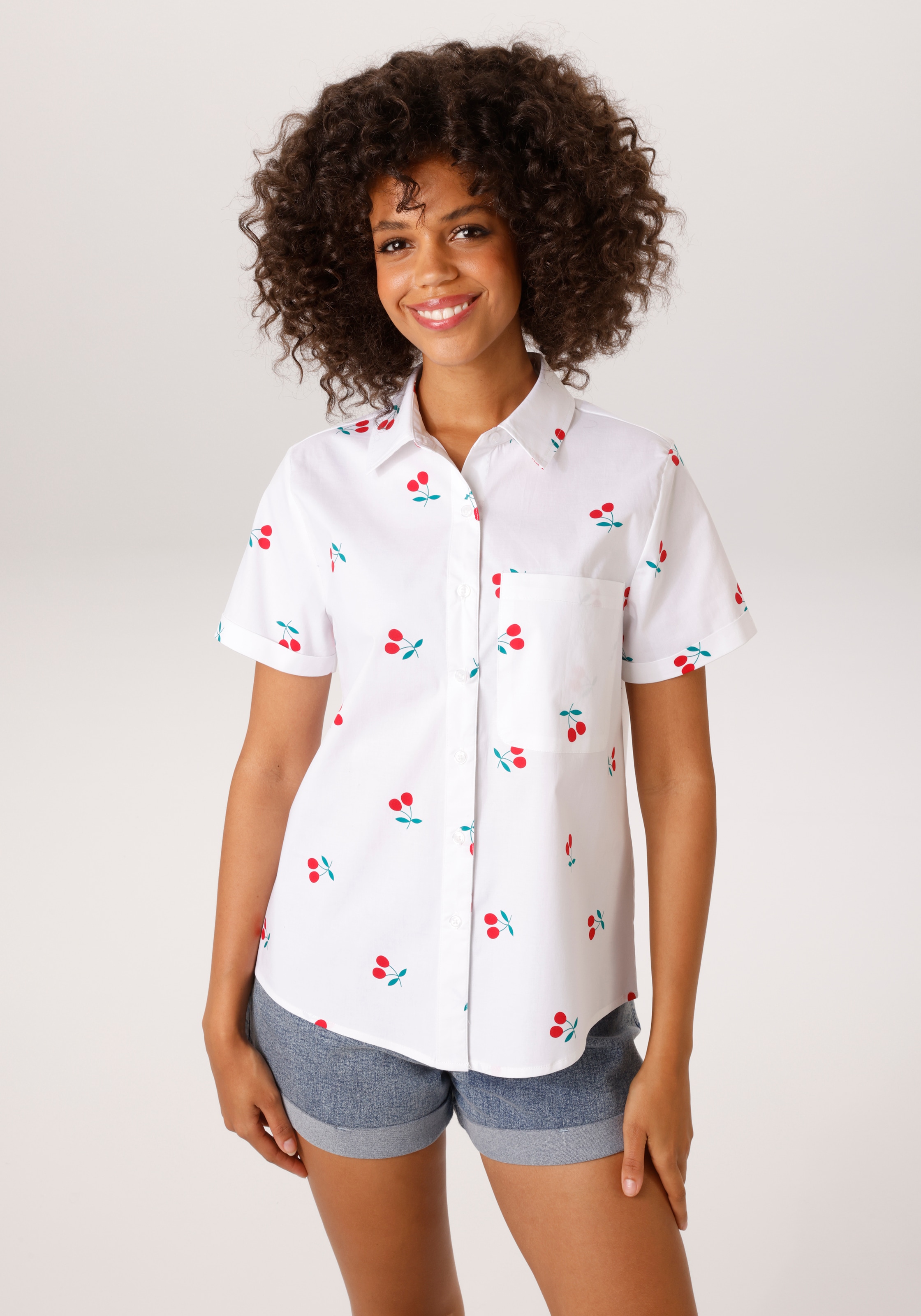 Auf dieser Druckbluse flattern rundum hübsche Schmetterlinge. In bequemer Schlupfform mit Rundhals-Ausschnitt, offenem V und kurzer Knopfleiste. Die langen Ärmel mit Knopfmanschette können lässig auf 3/4-Länge gekrempelt werden. Die Falte an der Rückenpasse gibt ihr die modische Weite. Leicht abgerundeter Saum. 100% Baumwolle. Maschinenwäsche.