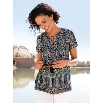 Kombifreundliche Druckbluse Mit kleinem V und kurzer Knopfleiste am Rundhals-Ausschnitt. Die langen Ärmel mit Knopfmanschette können auf 3/4-Länge gekrempelt und durch Riegel und Knopf fixiert werden. Leicht abgerundeter Saum. Eine tolle Passform erhält die Bluse durch die Brustabnäher und den Sattel mit weitegebender Falte hinten. Viskose in ECOVERO-Qualität von Lenzing. 100% Viskose (ECOVERO). Maschinenwäsche.