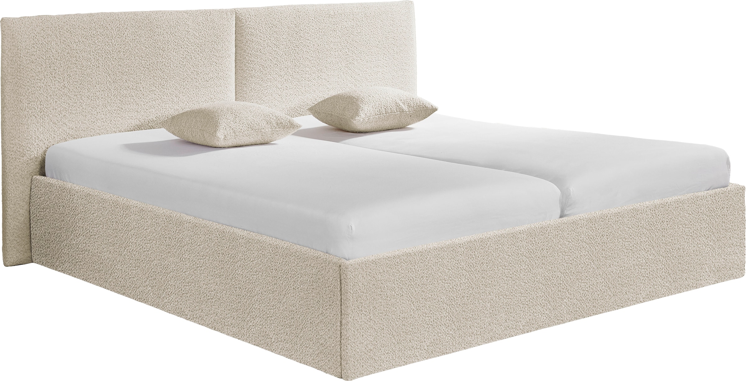 Détails du cadre de lit | mit kuschligem Bouclé bezogen;mit seitliche Auflageflächen für den Lattenrost;Ausführung Bettgestell, ohne Lattenrost und Matratze;Komforthöhe |