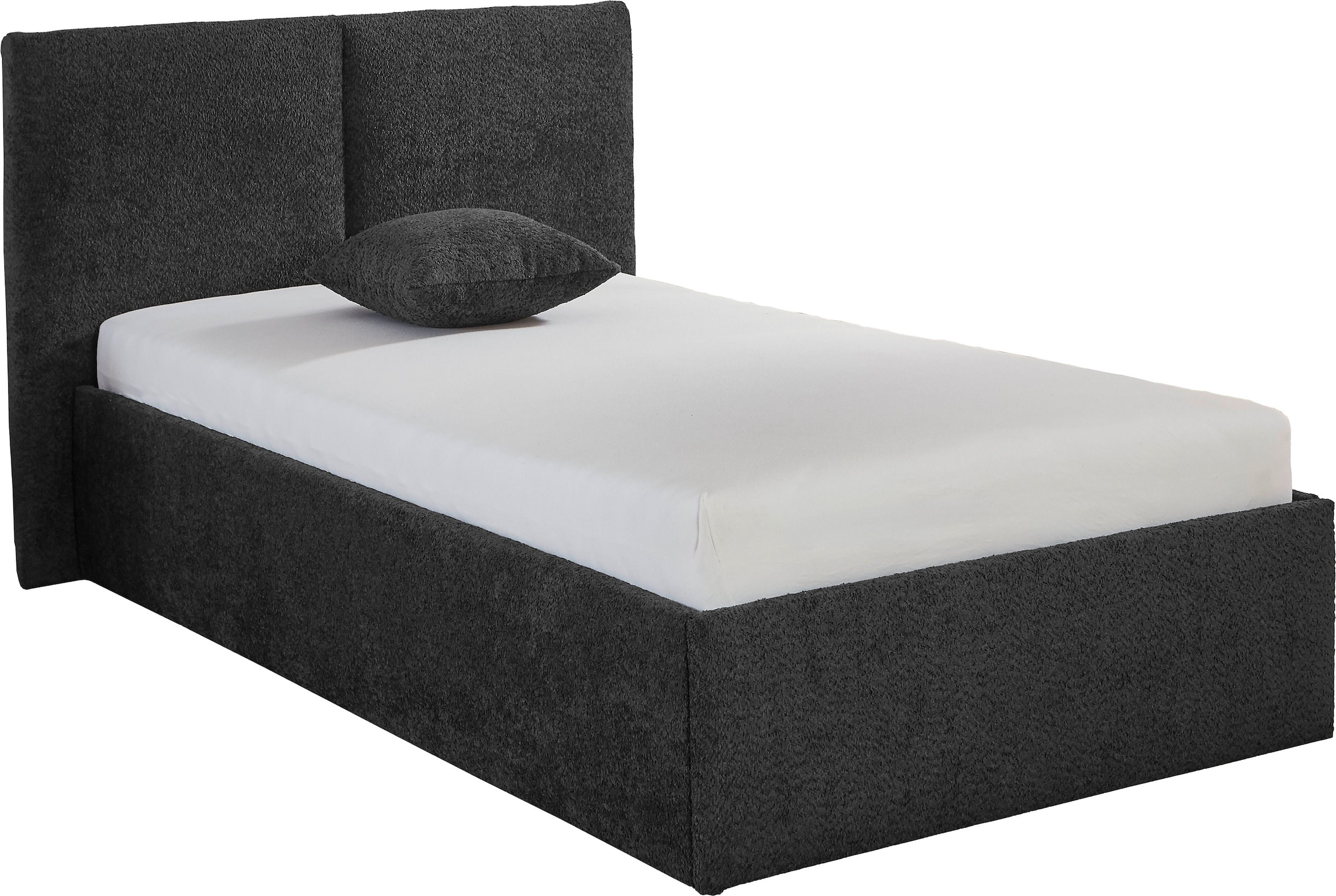 Détails du cadre de lit | mit kuschligem Bouclé bezogen;mit seitliche Auflageflächen für den Lattenrost;Ausführung Bettgestell, ohne Lattenrost und Matratze;Standardhöhe |