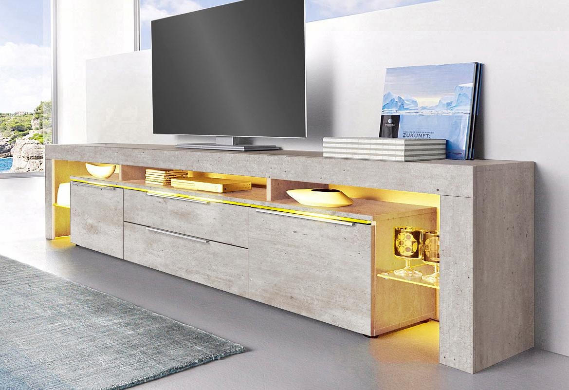 Faits intéressants | Phonoschrank mit 2 Türen und 2 Schubkästen auf Metall-Kugelführungen, oben 1 Ablage, B/T ca. 220/34 cm, unter dem Oberboden 3 beleuchtbare Glasböden, links und rechts Regalanbau mit je 1 festen Glasboden. Details: