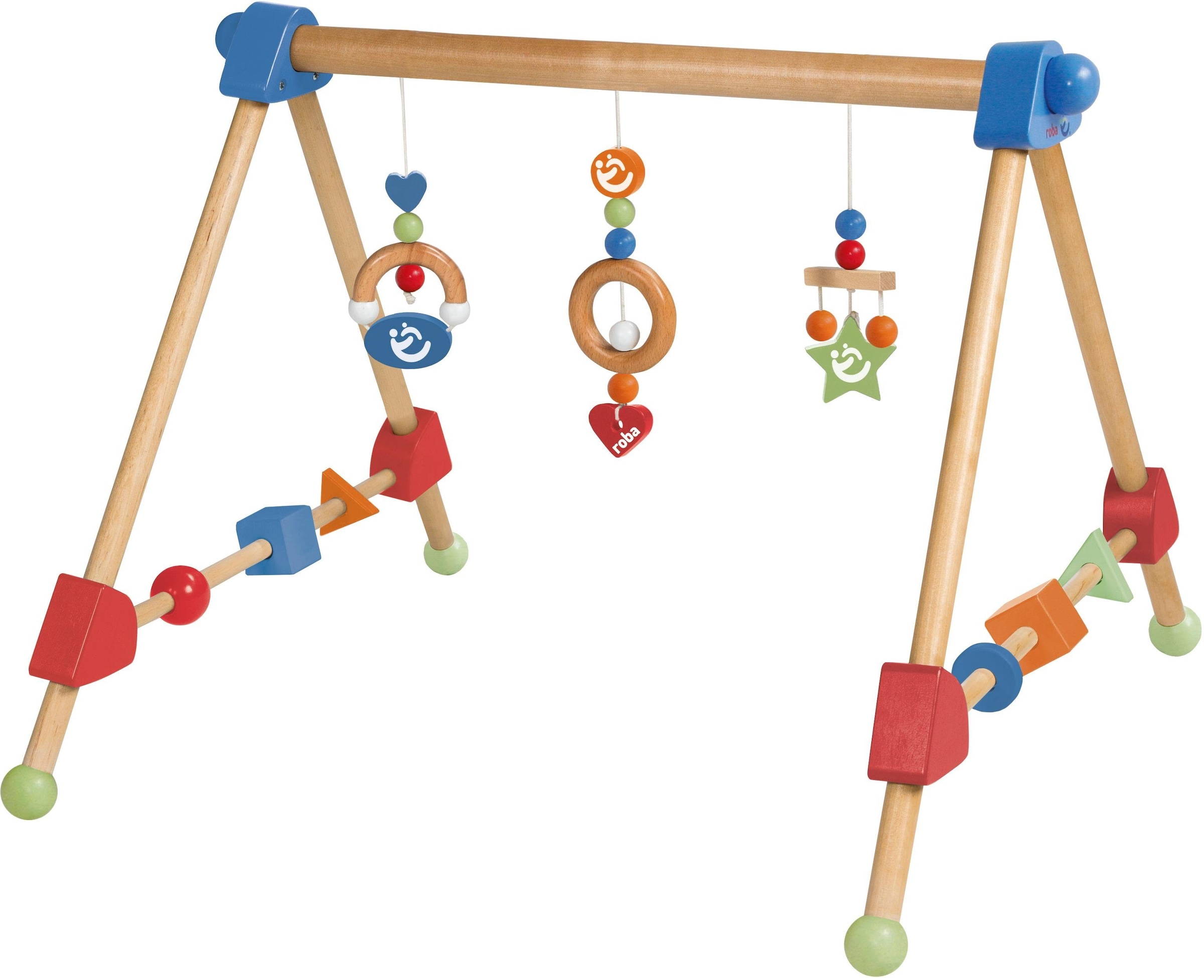 Der Roba Spielbogen aus Massivholz fördert bei Ihren Kleinsten von Geburt an die Beweglichkeit und Motorik. Die 3 liebevoll gestalteten, bunten Spielelemente zum Klappern, Klingeln, Greifen und Beissen lassen sich bequem in der Höhe verstellen. Die jeweiligen Schnüre werden einfach bis zu drei Mal um den oberen Querholm gewickelt und somit werden die einzelnen Elemente schrittweise nach oben oder unten verstellt. Die Seitenholme des Spieltrapezes bieten weitere fröhlich bunte Elemente zum Verschieben und Drehen.