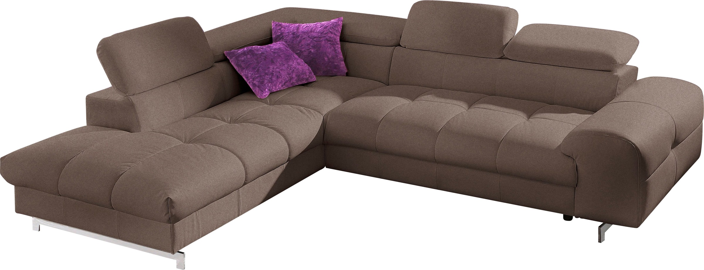 Moderne Polsterecke, wahlweise mit Bettfunktion. Besonders gemütlich durch 2 grosse (50x50cm) und 2 kleine (40x40cm) Zierkissen. Praktische Bettfunktion, einfach ausklappen? fertig! Stabiles Holzuntergestell, atmungsaktive Polyätherschaum-Polsterung und komfortable Wellenunterfederung sorgen für einen bequemen Sitz. Gleich den passenden Hocker mitbestellen. Dieses Polster ist aus FSC-zertifiziertem Holzwerkstoff. In verschiedenen ausgezeichneten Bezugsqualitäten erhältlich: Primabelle-Microfaser aus 100& Polyester, Struktur-Bezug aus 85% Polyester + 15% Acry, Materialmix Struktur (100% Polyester) mit Kunstleder, NaturLEDER, das handschuhweiche Rindsleder in Sitz und Rücken (Korpus in farblich passendem Kunstleder)