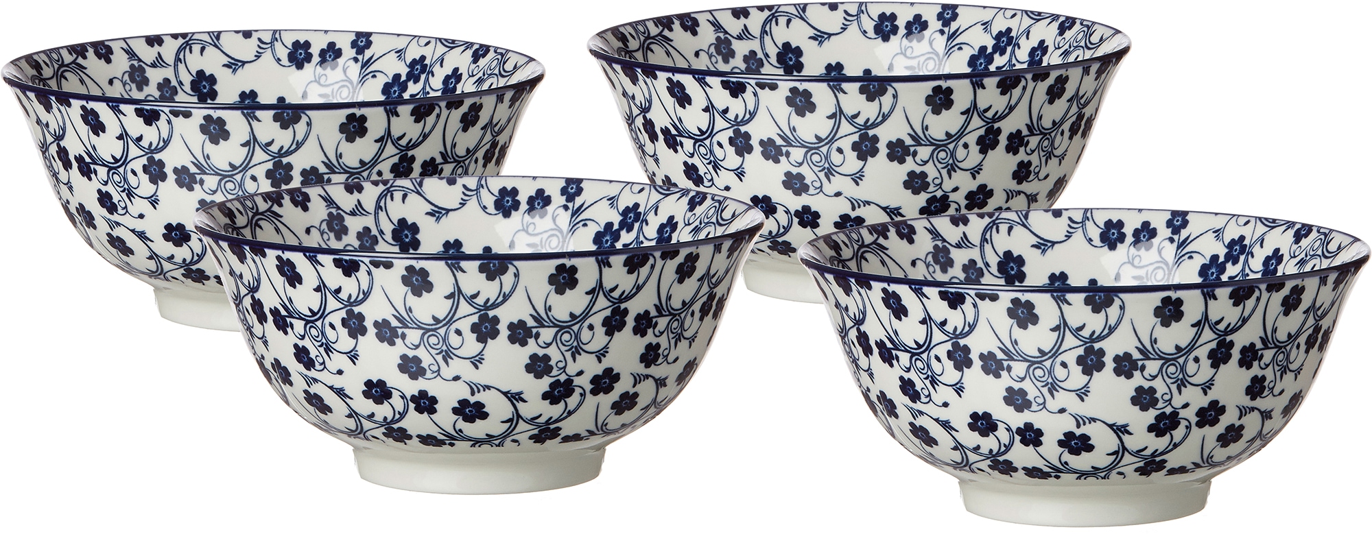Ritzenhoff & Breker Müslischalen, Keramik, 4 Teile, »ROYAL SAKURA«. Die Geschirrserie »Royal« erobert als zeitgemäss stylische Adaption traditioneller japanischer Reisschalen-Dekore nicht nur die Herzen trendbewusster Kosmopoliten. Das Dessin »Sakura«, bei dem sich florale Ornamente aus zierlichen Blüten und Blättern liebevoll über die Geschirrteile ranken, erinnert an die japanische Kirschblüte. Damit hat zwar jede der drei royalblauen Dessinvarianten »Sakura«, »Makoto« und »Reiko« der Serie »Royal« seinen ganz individuellen Charakter, im gemeinsamen Mix & Match bieten sie aber dennoch einen ausgesprochen harmonischen Anblick im typischen »Land des Lächelns«-Look. Ein besonderer Reiz liegt darin, dass die Dekore bei allen Geschirrteilen vollflächig aufgebracht sind, damit die schönen Dessins richtig zur Geltung können. Set bestehend aus: 4 Schalen, ca. 650 ml, 7,5 cm hoch und 15,5 cm Ø. Material: Keramik. Spülmaschinen- und mikrowellengeeignet.