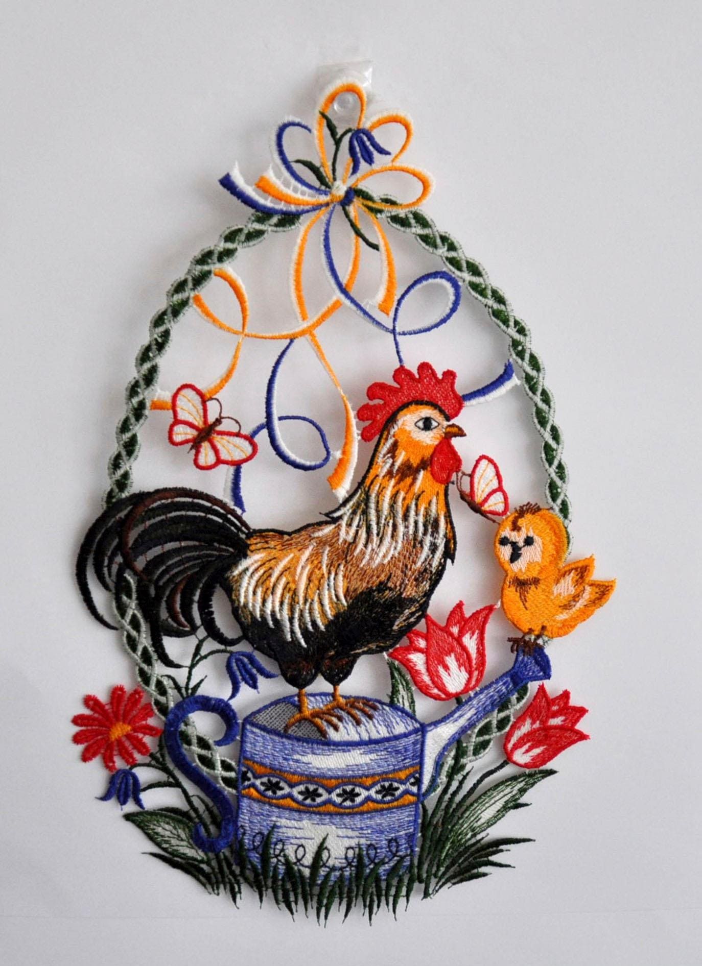 Stickereien Plauen Tableau de fenêtre »Hahn auf Kanne«