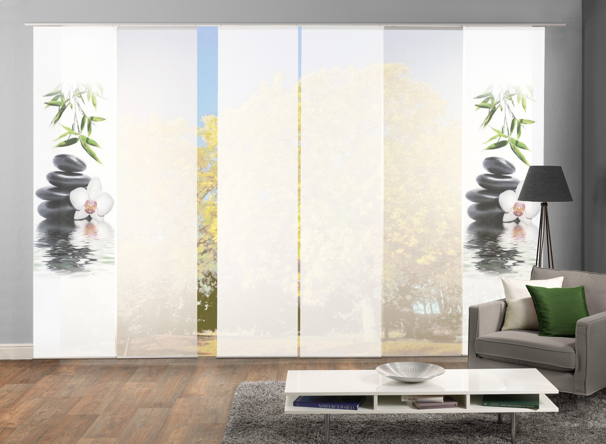 Schönes modernes Schiebevorhangset der Marke HOME WOHNIDEEN. Die Schiebevorhänge bestehen aus 100% Polyester. Sie werden inkl. Paneelwagen und Klemmleiste geliefert. Das Set besteht aus 6 Schiebevorhängen 2 digitalbedruckte (blickdicht) , 2 Uni (halbtransparent) und 2 Uni (blickdicht).