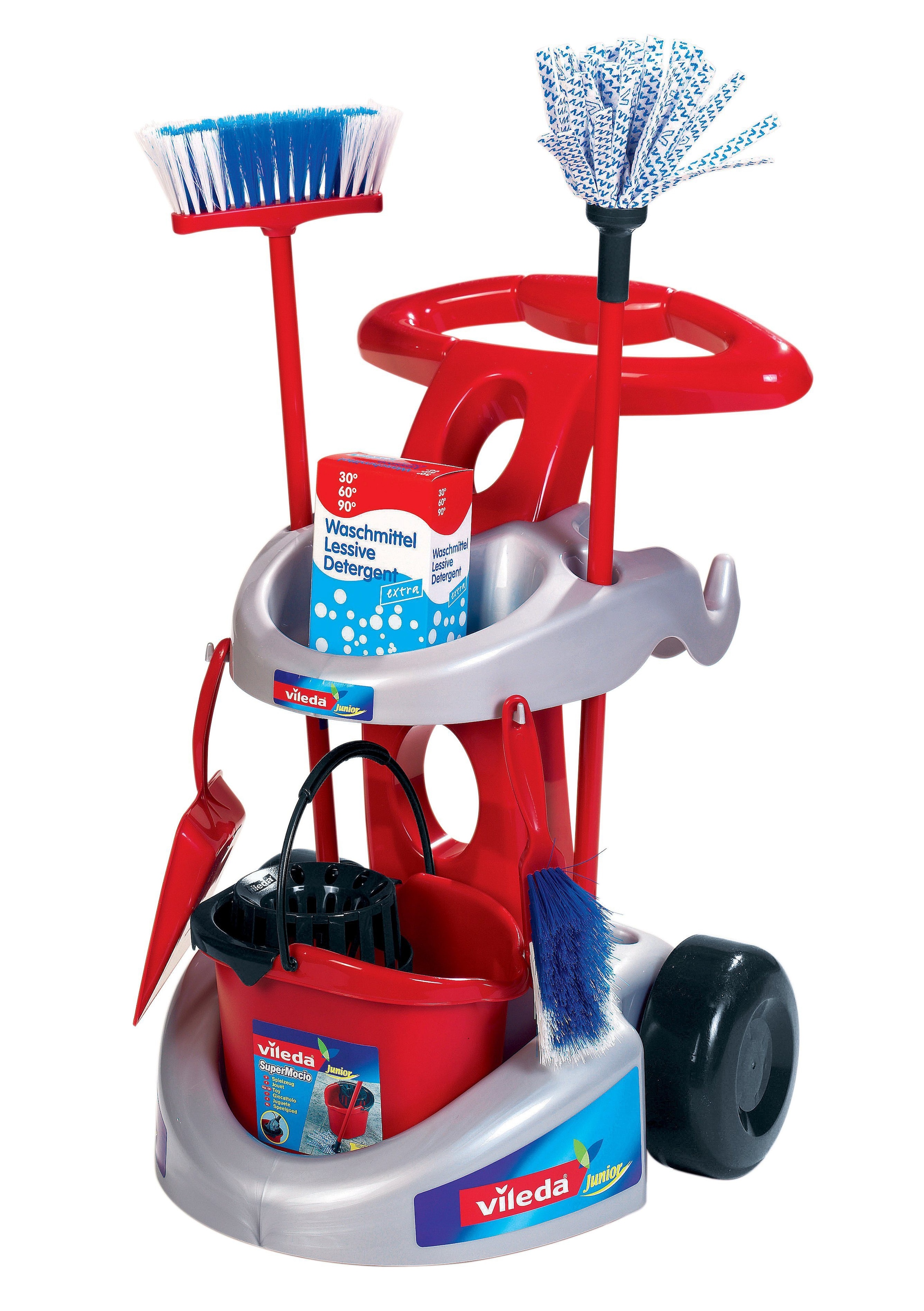 Klein Vileda Besenwagen. Mit Besen, Wischmop, Eimer mit Aufsatz, Handfeger, -schaufel und Waschmittelschachtel. Höhe ca, 53 cm. Ab 3 Jahren. Warnhinweise: Achtung! Nicht geeignet für Kinder unter 36 Monaten.