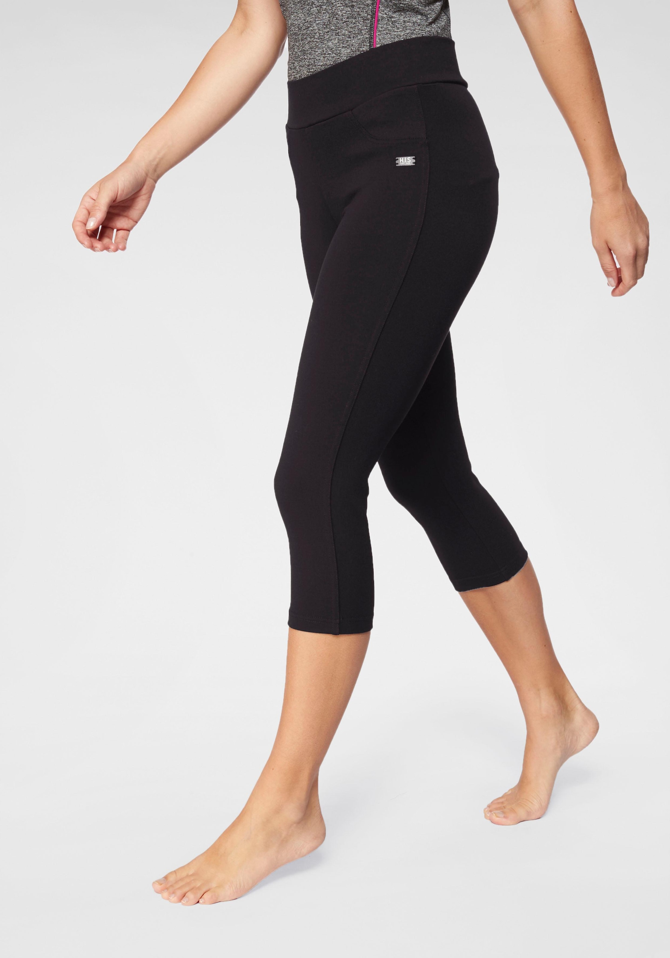 3/4-Leggings von H.I.S mit kleinem Logoemblem vorn. Durch tonige Nähte angedeutete Taschen und Verschluss vorn. Breites Bündchen für einen komfortablen Sitz. Weich fliessende, elastische Qualität.