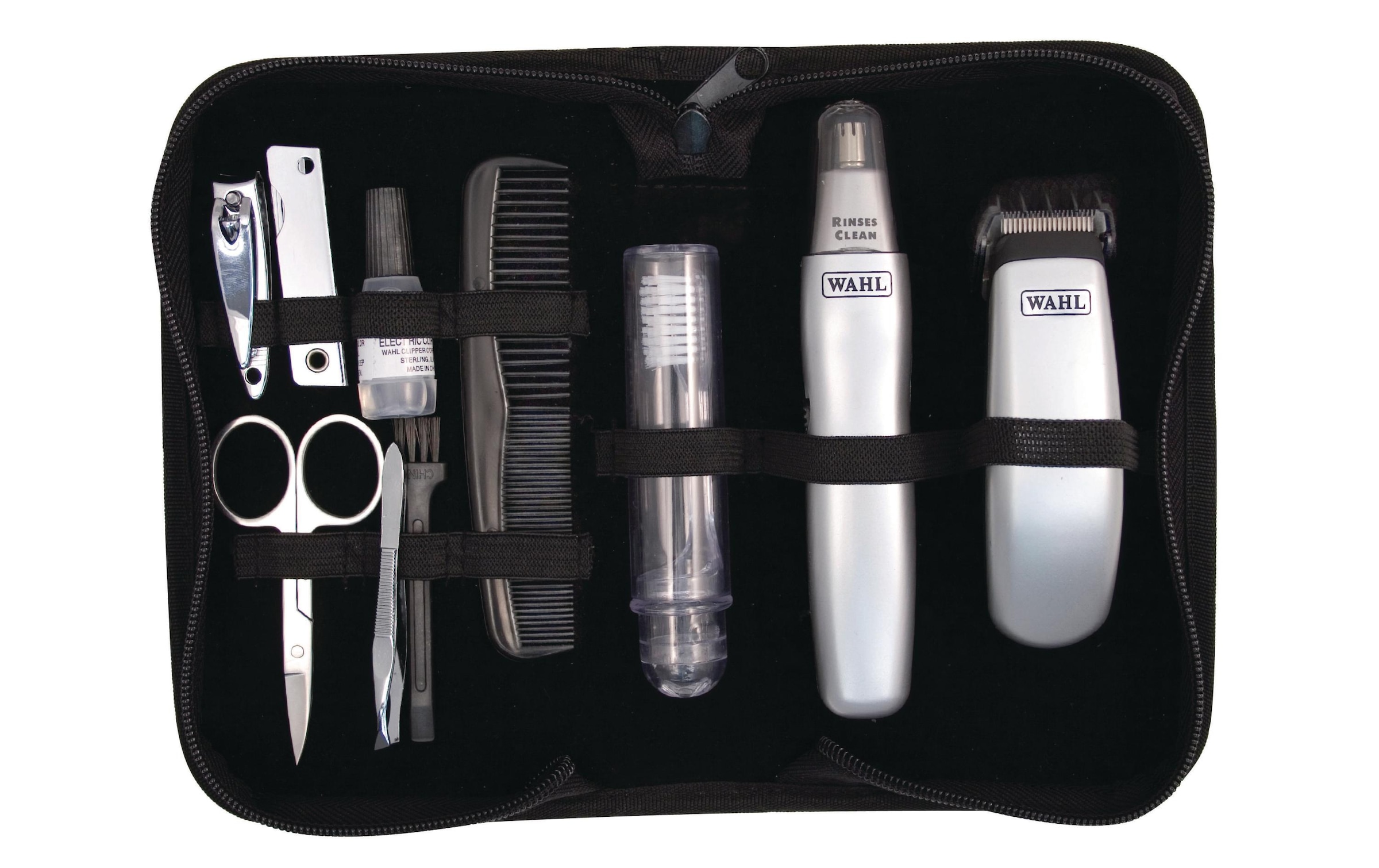 Lieferumfang | 2 AA-Batterien;Aufsteckkamm für Trimmer;Reinigungsbürste;Zahnbürste;Batteriebetriebener Trimmer;Kamm;Klingenöl;Nagelfeile;Nagelknipser;Nagelschere;Nasen-/Ohrhaarschneider;Pinzette |