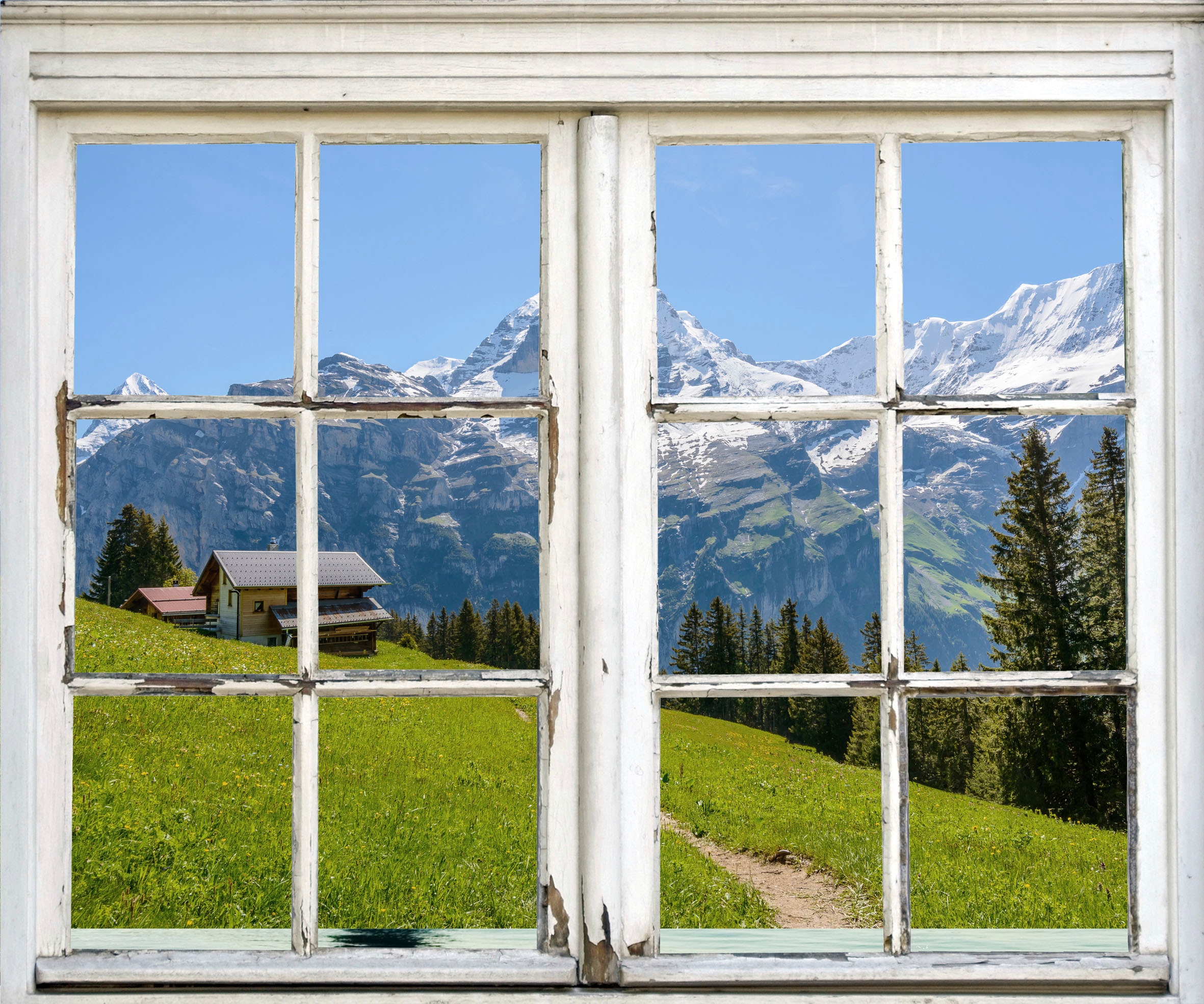 Bildquelle: queence Wandsticker »Hütte in den Bergen« Wandsticker, Wandbild, selbstklebend, 3D, Fenster