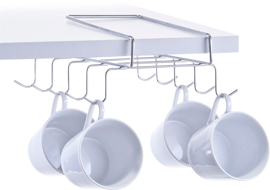 Der Tassenhalter von Zeller Present ist eine praktische Alternative, wenn der Platz in der Küche knapp bemessen ist. Einfach den Halter unter ein Regal mit einer maximalen Stärke von ca. 3 cm hängen und schon kann man bis zu 10 Tassen griffbereit verstauen. Dank des modernen Designs passt der praktische Tassenhalter in jeden Haushalt.