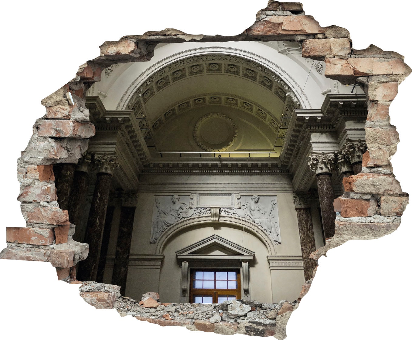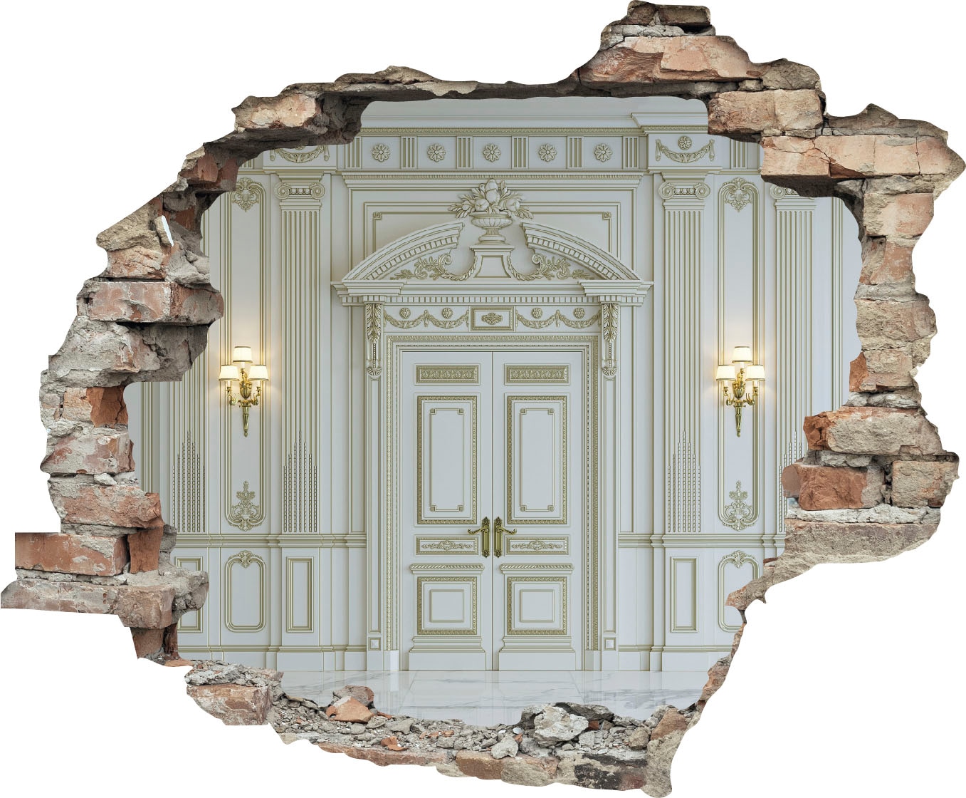 - Das Design des 3D-Wandtattoos illustriert ein Fenster in einer Wand, wodurch der Blick auf das eigentliche Motiv freigelegt wird.