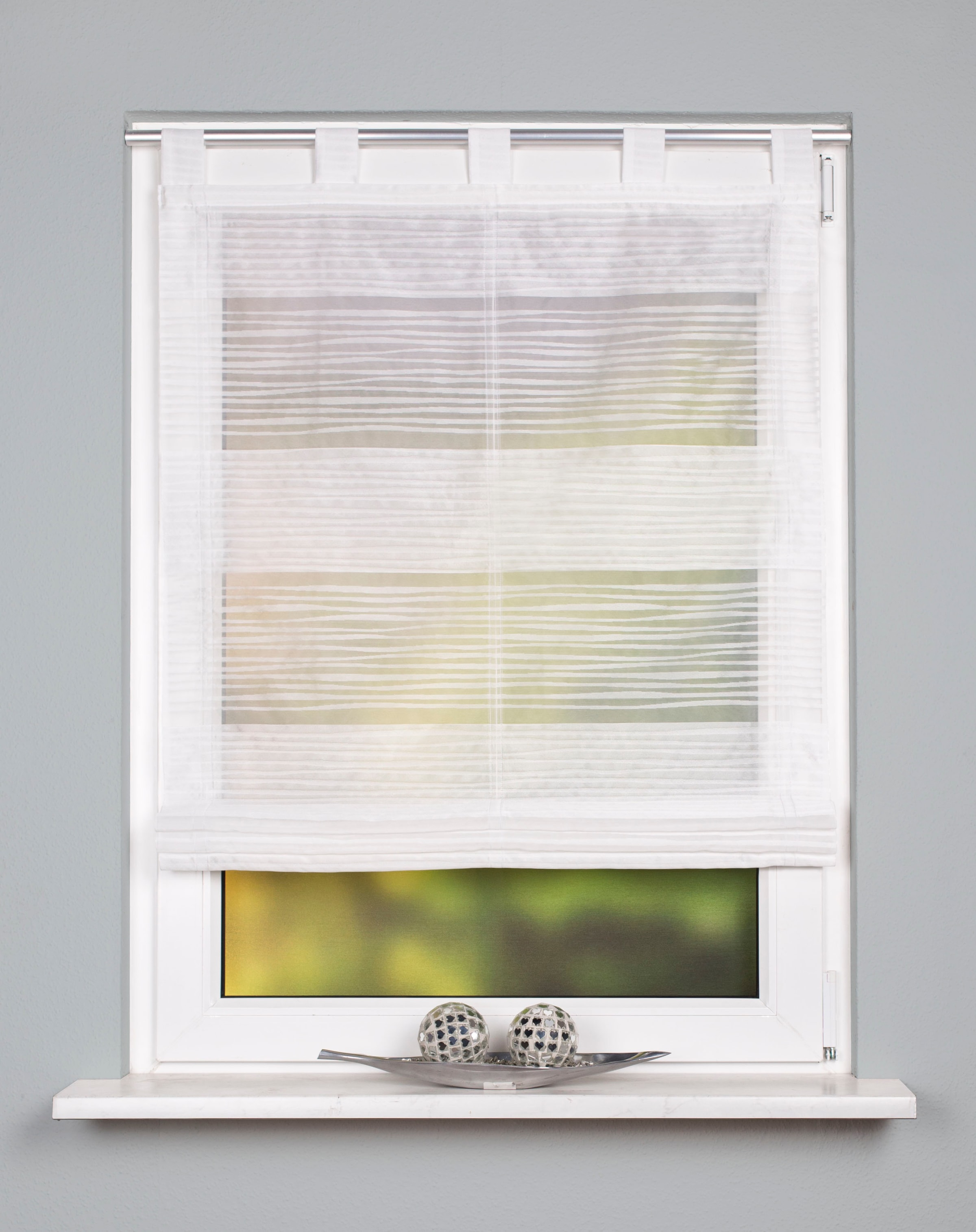 Das halbtransparente Schlaufenrollo aus Halborganza mit Querstreifen gibt Ihrem Ambiente einen dezenten Look. Durch die oben angebrachten Schlaufen lässt sich Ihr Rollo kinderleicht an Ihrer Gardinenstange aufhängen. Dank Stoppertechnik lässt sich dieses tolle Rollo in der Höhe stufenlos verstellen. Der Lieferumfang umfasst das komplette Zubehör sowie 1 Rollo. Material: 100% Polyester