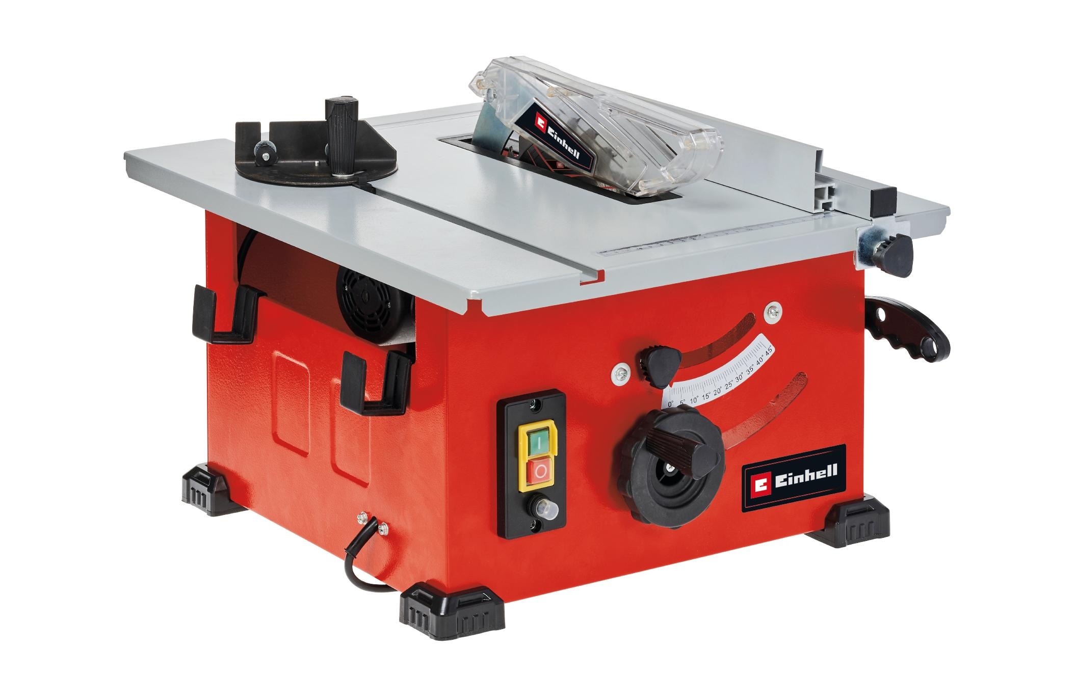 Die Einhell Tischkreissäge TC-TS 210 ist ein kraftvolles Werkzeug, mit dem der ambitionierte Heimwerker mühelos und präzise Bau- und Hobbymaterial wie Massivholz, Holzwerkstoff- und Faserplatten sowie beschichtete oder furnierte Hölzer schneiden und verarbeiten kann, Die Tischkreissäge arbeitet mit einer maximalen Leistung von 1200 W und einer Leerlaufdrehzahl von 4800 UpM, Der Grosse Arbeitstisch mit einer Grundfläche von 525 x 440 mm ist für ein angenehmes Arbeiten ausgelegt, Zusätzlich ist der Arbeitstisch mit einer übersichtlichen Skala ausgestattet, Das Sägeblatt ist stufenlos höhenverstellbar, Schnitte können im Winkel von 45° bis zu 90° für saubere Gehrungsschnitte stufenlos eingestellt werden, Die maximale Schnitthöhe beträgt bei 45° 27 mm, bei 90° 45 mm, Mühelos arbeitet sich das Sägeblatt mit den Hartmetallsägezähnen durch das Material, Zudem sorgt ein Parallel- und Winkelanschlag für präzise Schnitte, Für das sichere Arbeiten sorgt ein Schiebestock, zum Schutz des Motors ist ein Überlastschutz integriert, Die Kunststofffüsse am Metallgehäuse bieten einen sicheren und rutschfesten Stand,