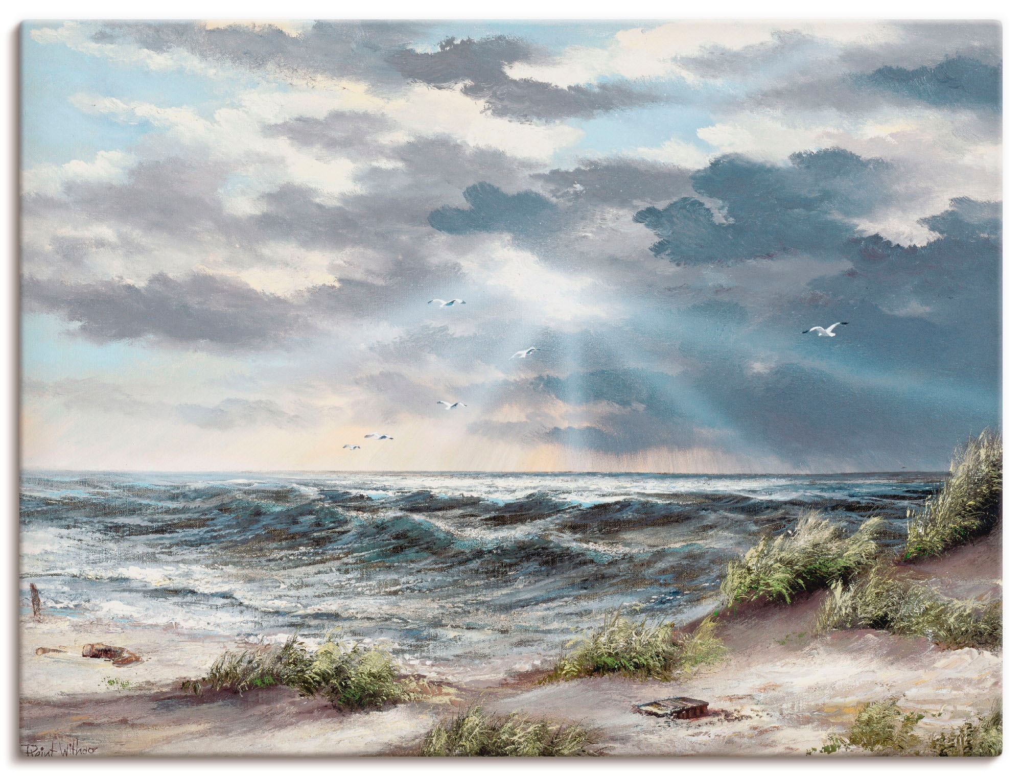 Mit viel Liebe für kunstvolles Wohnen verleiht unser Wandbild mit dem Motiv Dünen an der stürmischen See von Reint Withaar Deinem Zuhause Charakter. Es begeistert durch hochauflösende Druckqualität und hochwertige Materialien – Made in Germany.