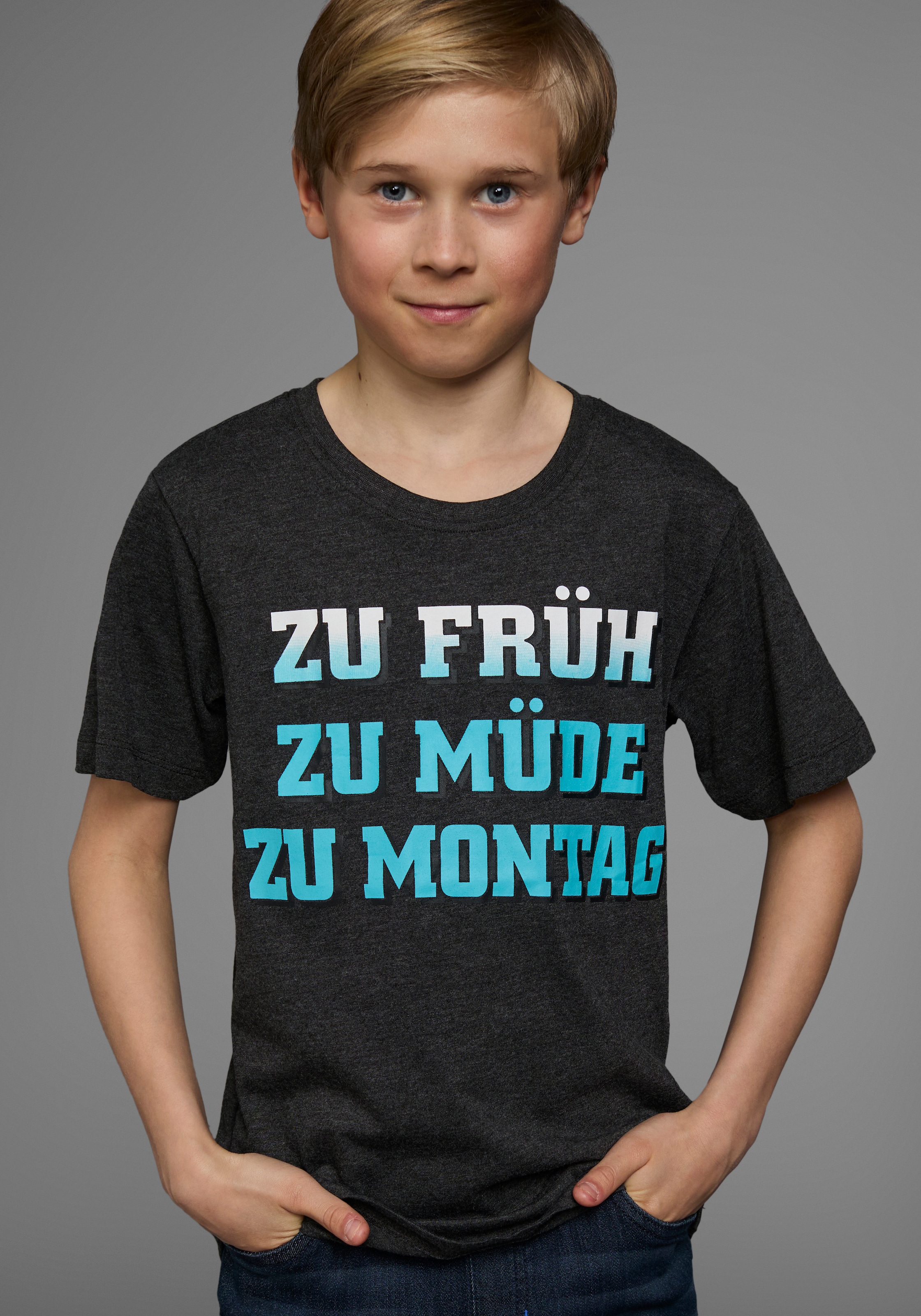 KIDSWORLD T-Shirt »Mit Spruch: ZU FRÜH, ZU MÜDE...« Kurzarm, Basic-Passform, mit stylischem Print, Rundhalsausschnitt