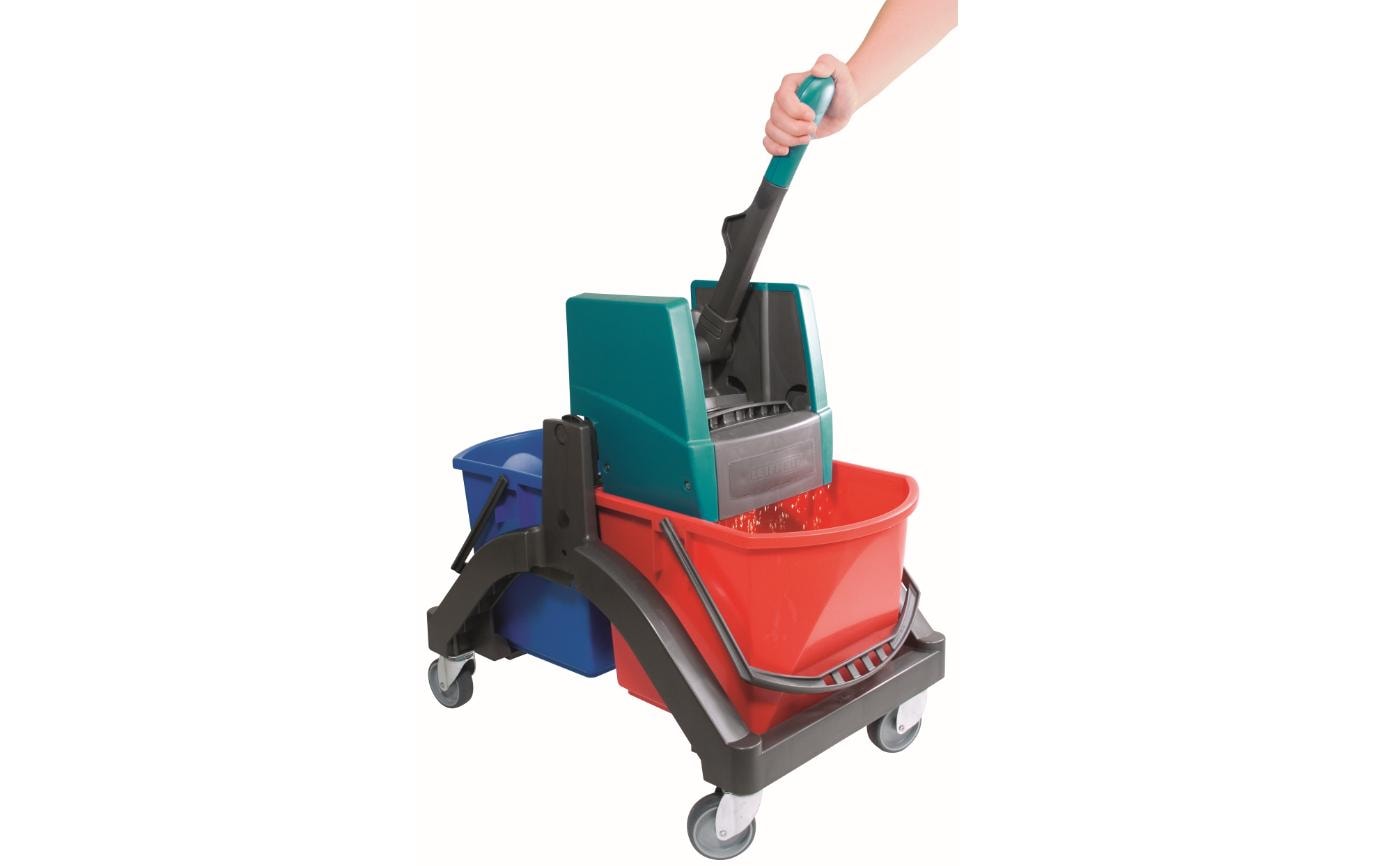Dank dem stabilen Fahrgestell und dem Platz für zwei grosse Eimer bietet der Nasswischwagen die Grundausstattung für eine professionelle und hygienische Bodenreinigung, Beide Eimer haben ein Volumen von 17 l, wobei der blaue für Frischwasser und der rote für Schmutzwasser gedacht ist, Mit der abnehmbaren Handhebelpresse können Sie deutlich Zeit sparen, So pressen Sie die Wischbezüge mit minimalem Aufwand aus, Die vier 360°-Leichtlaufräder machen den Wagen besonders mobil und beweglich,