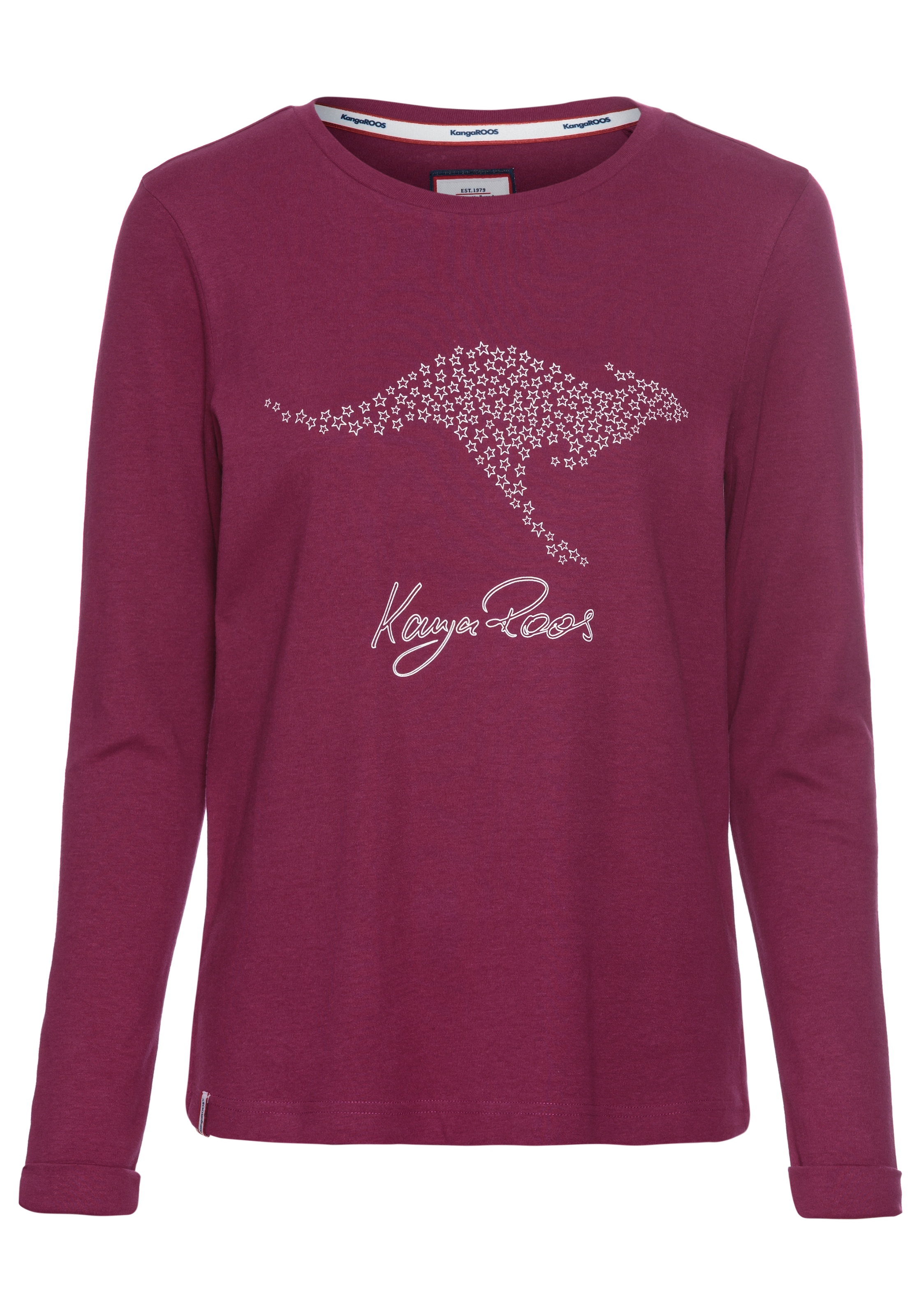 Kombistarkes Sweatshirt für Frauen von KangaROOS. Mit einem hüftbedeckenden und figurumspielenden Schnitt. Die Ärmel sind lang. Es ist mit einem coolen Logodruck versehen. Durch die formstabile und weiche Interlock-Qualität fühlt sich das Oberteil beim Tragen besonders angenehm an.