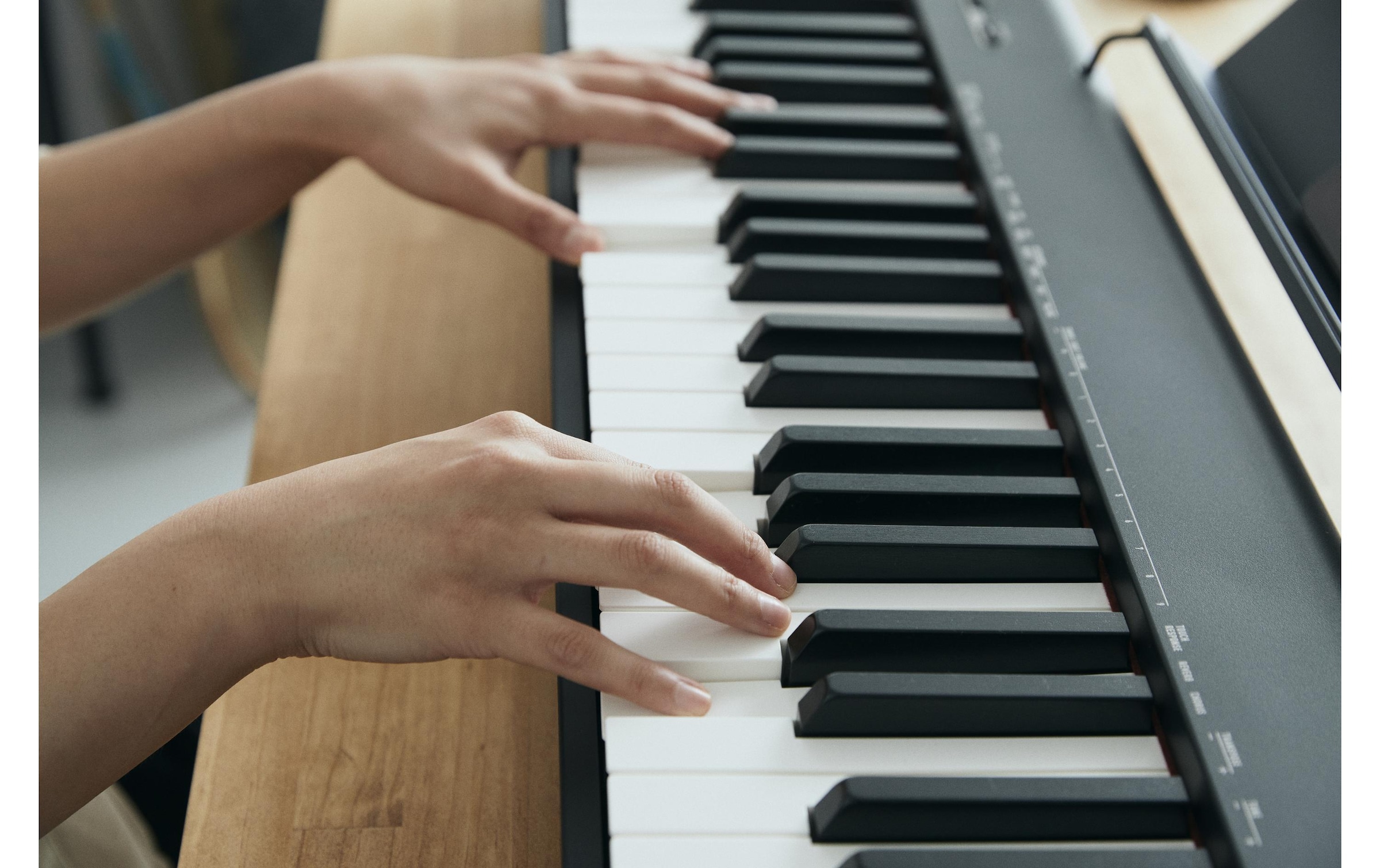 - Gewichtete 88-Tasten-Tastatur mit 3 Empfindlichkeitsstufen und synthetischer Ebenholz- und Elfenbein-Textur