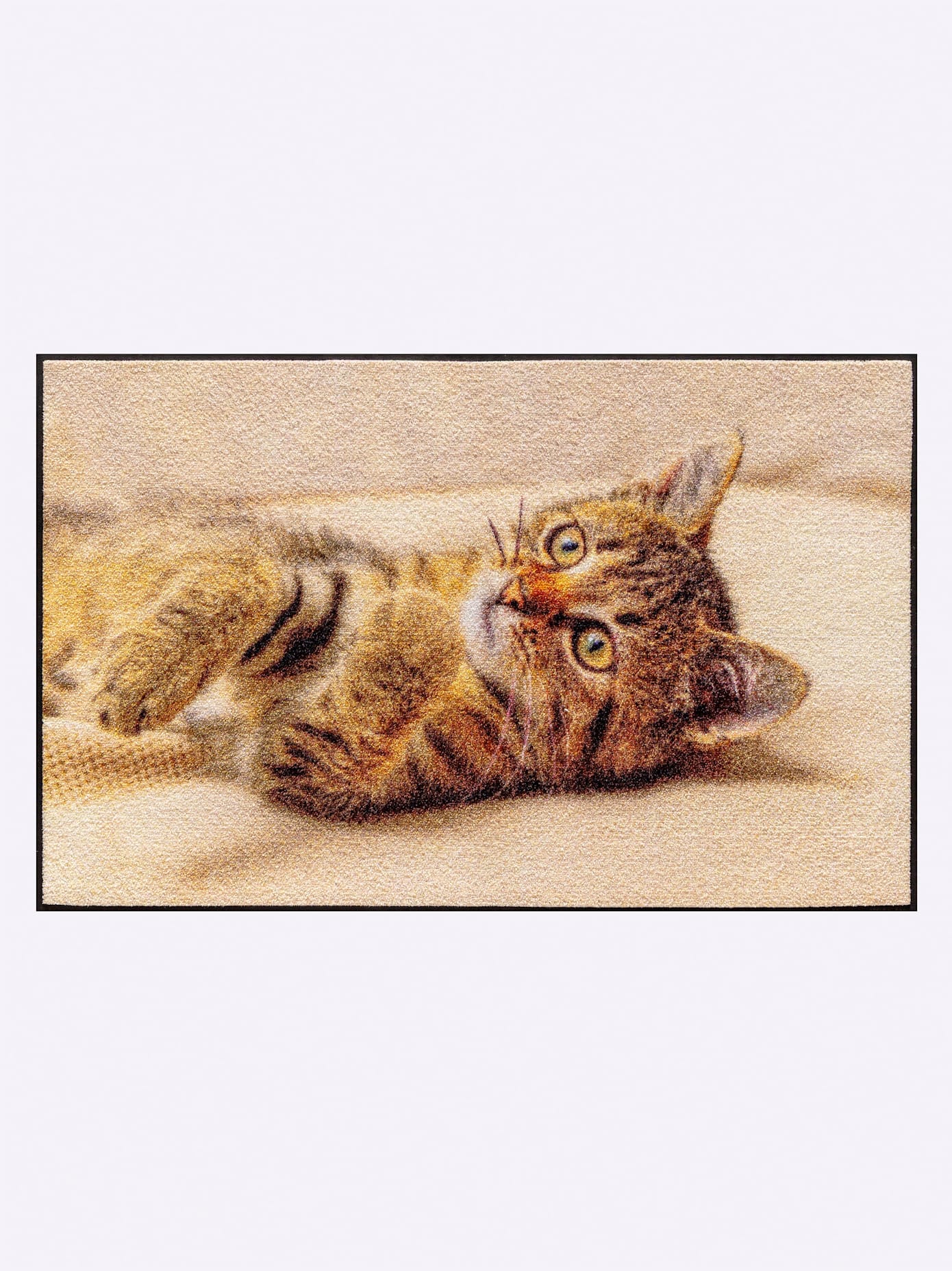 Zum Träumen lädt Sie die Fussmatte Romance von wash+dry by Kleen-Tex ein. Ein Katzenpärchen, das auf den Dächern sitzt und den Mond geniesst. Mit einem leicht abstrakten Touch wirkt es beinahe wie ein Kunstwerk unter Ihren Füssen. Individuell einsetzbar als klassische Fussmatte vor dem Eingang, als Eyecatcher in Flur oder Garderobe, aber auch auf Balkonen, Terrassen und in Wintergärten sind die wash+dry-Matten immer ein optisches Highlight und nützlicher Helfer zugleich. Neben dem dekorativen Aspekt kommt bei allen wash+dry Matten die Funktion nicht zu kurz. Zuverlässig nimmt der flache, dichte Flor aus Polyamid Schmutz und Feuchtigkeit auch in hoch frequentierten Bereichen auf. Die rutschhemmende Rückenbeschichtung aus Nitrilgummi sorgt für sicheren Stand. Aufgrund der Farbechtheit und Formstabilität kann die Matte einfach in der Waschmaschine (bei maximal 60 Grad) und auch im Trockner (Programm: Mischgewebe) gereinigt werden, um die jahrelange Freude an der Matte zu gewährleisten. Pflegen Sie so Ihre wash+dry Fussmatte 3 bis 4 Mal im Jahr (bei starker Belastung auch häufiger). Für die tägliche Reinigung ist der Teppich leicht zu saugen und auch für den Saugroboter geeignet, da der Flor sehr flach ist. Die Fussmatte ist 100% PVC-frei. Bei PVC-Böden, Linoleum-, Laminat- und Holzböden kann es durch eine Wechselwirkung mit gummibeschichteten Matten zu einer Farbveränderung der Oberfläche kommen. Für alle Produkte behalten wir uns eine produktionsbedingte Toleranz in der Grösse von +/- 3% vor. Farbabweichungen können auftreten. Das Design Romance gibt es in der Grösse 50/75cm.