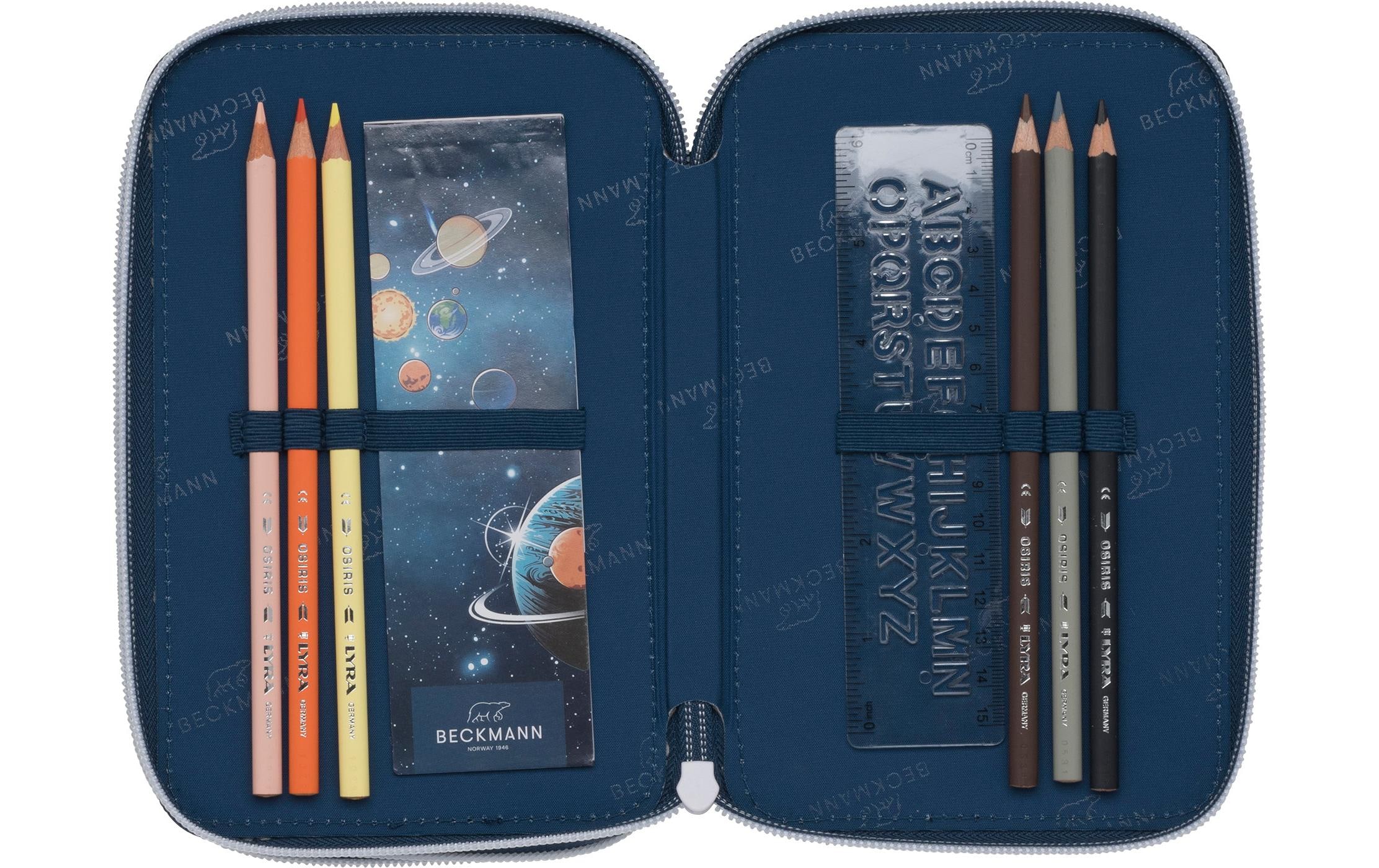Beckmann Schlamperetui Classic Trip. Abmessung (B x L x H): 12 x 20.5 x 7 cm. Aussenmaterial: 100% Polyester. Etui für die Schule mit Bleistiften, Jumbo Buntstiften Buntstiften, Radiergummi, Lineal, Doppel Anspitzer, Stundenplan und herausnehmbaren Geldbörse. In den Farben:. Mit Reissverschluss.