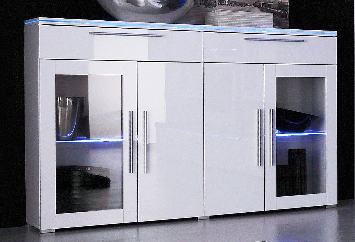 Wissenswertes | Topmodernes Anbauprogramm mit tollen Lichteffekten (Beleuchtung optional). In 2 Farben: schwarz oder weiss mit hochglänzenden Fronten. Schubkästen auf Metallschienen. Hinter den Türen je 1 Glasboden (Fachinnenmasse hinter den Glastüren B/T/H: jeweils ca. 67,5/29,2/39 cm). Oben 2 Schubkästen (Innenmasse B/T/H: 64/27/12 cm). Gesamtmasse (B/T/H): 140/34/102 cm. Alles ca.-Masse. Selbstmontage mit Aufbauanleitung. Passende Beleuchtung bitte extra bestellen. Wir empfehlen für das Highboard eine LED-Glaskantenbeleuchtung im 5er-Set (Artikelnummer: 800527). |