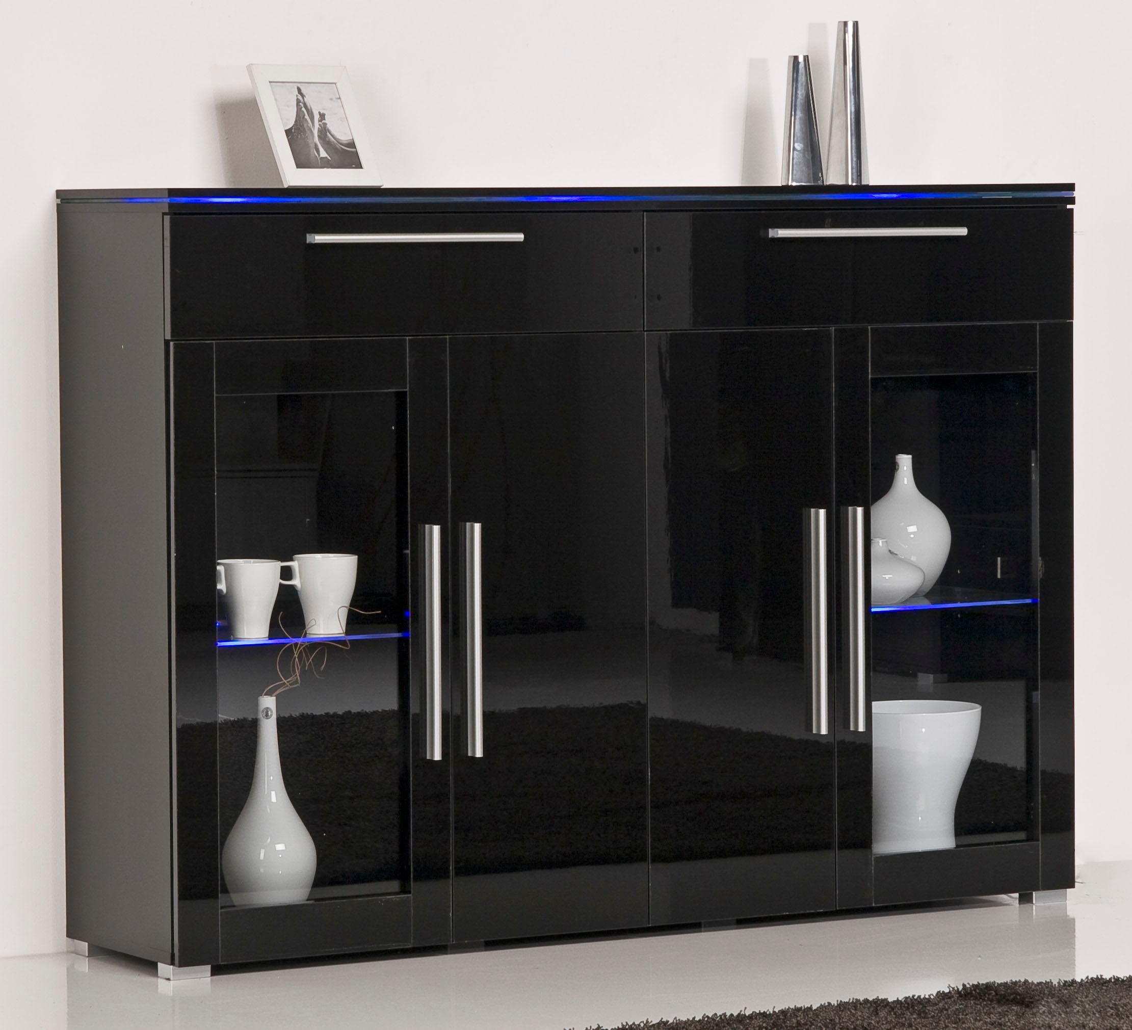 Wissenswertes | Topmodernes Anbauprogramm mit tollen Lichteffekten (Beleuchtung optional). In 2 Farben: schwarz oder weiss mit hochglänzenden Fronten. Schubkästen auf Metallschienen. Hinter den Türen je 1 Glasboden (Fachinnenmasse hinter den Glastüren B/T/H: jeweils ca. 67,5/29,2/39 cm). Oben 2 Schubkästen (Innenmasse B/T/H: 64/27/12 cm). Gesamtmasse (B/T/H): 140/34/102 cm. Alles ca.-Masse. Selbstmontage mit Aufbauanleitung. Passende Beleuchtung bitte extra bestellen. Wir empfehlen für das Highboard eine LED-Glaskantenbeleuchtung im 5er-Set (Artikelnummer: 800527). |