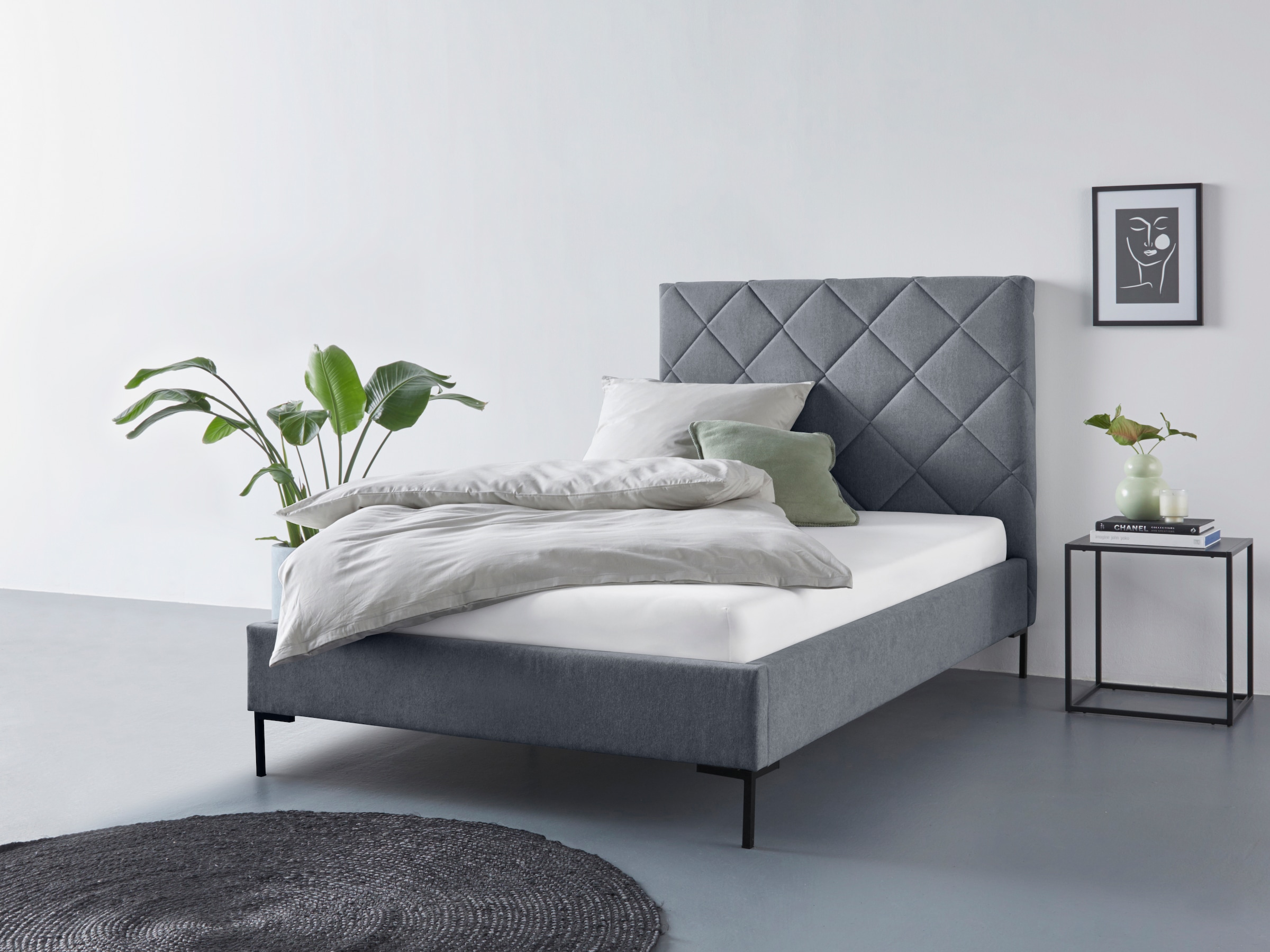 - Hohes Kopfteil mit edler Kreuzsteppung