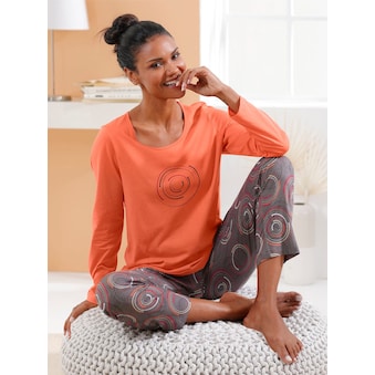 Weich fliessender Pyjama von Vivance Dreams. Shirt mit weitem Rundhalsausschnitt und halblangen Ärmeln mit elastischem Saum. Weit geschnittene Hose im Paisleymuster mit Dehnbund. Bequeme Passform. Jerseyware aus Viskose.