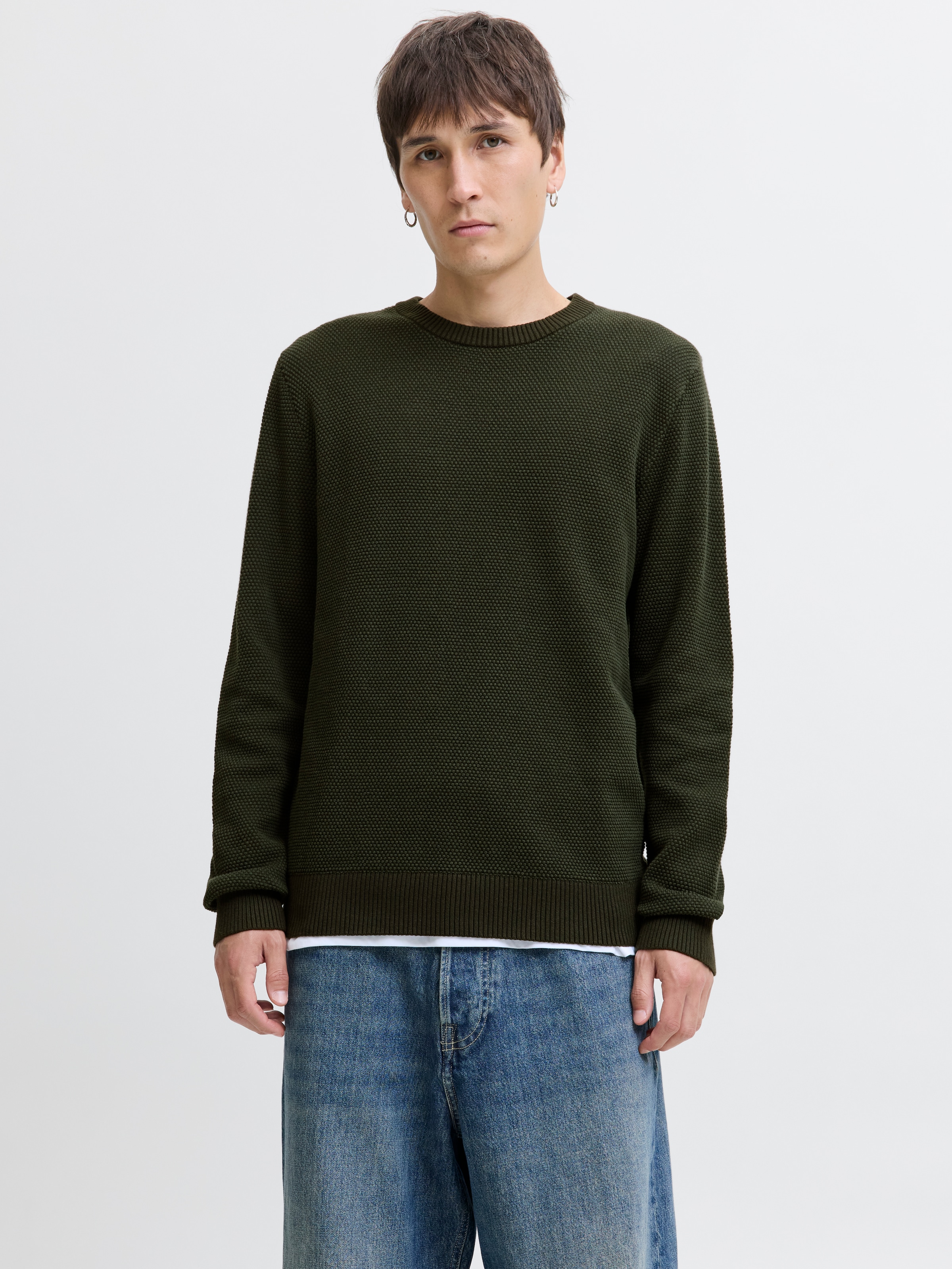 Aktueller Herren-Rundhalspullover von Jack & Jones. Mit einem taillenbedeckenden und normalen Schnitt. Der Ausschnitt hat ein Rippbündchen. Die Ärmel sind lang. Das Oberteil ist besonders bequem und wärmt durch die Strick-Qualität.