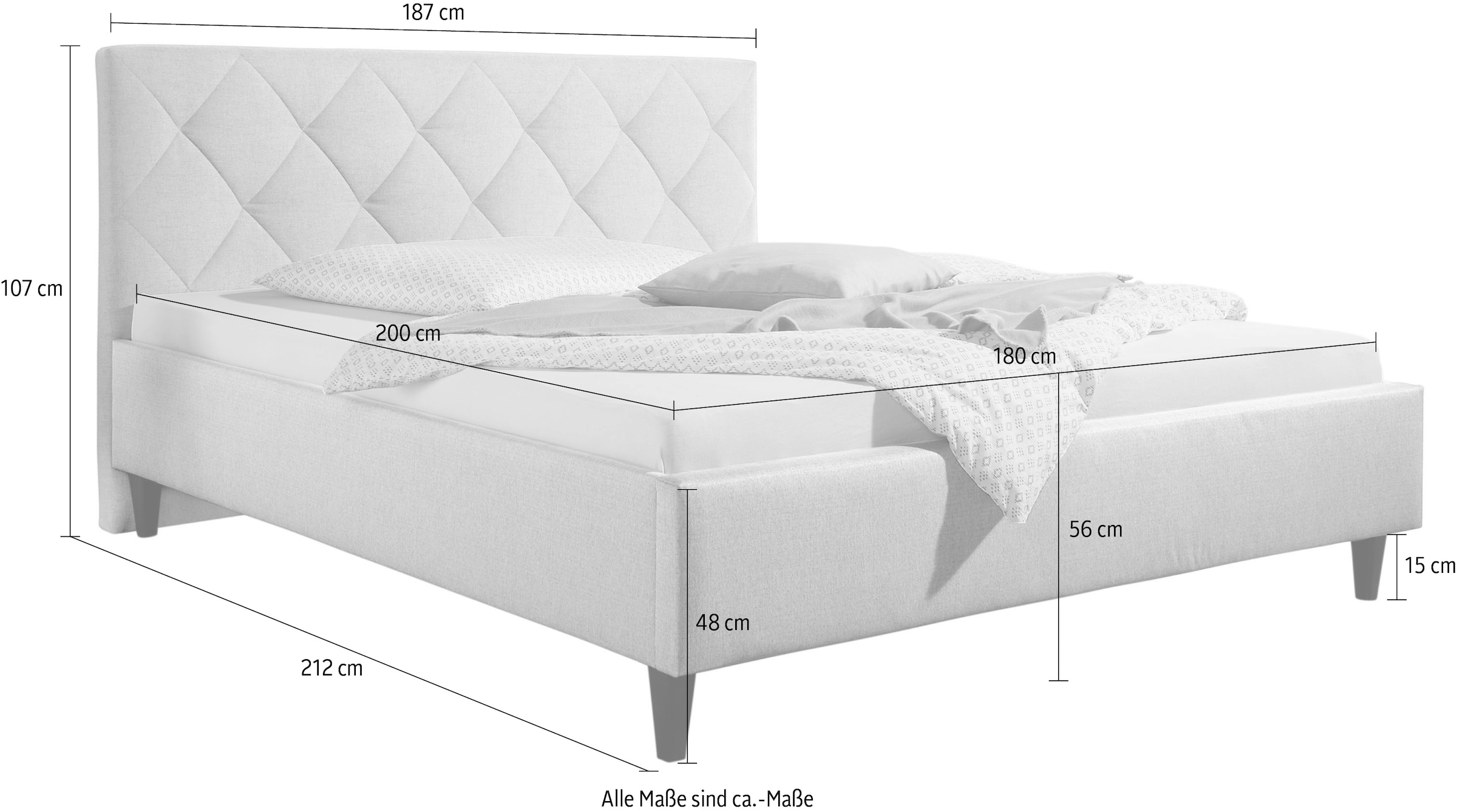 Details Bettgestell | seitlich ca. 3 cm und vorne ca. 5 cm stark aufgepolstert, glatt bezogen. Bettseitenhöhe ca. 27 cm |