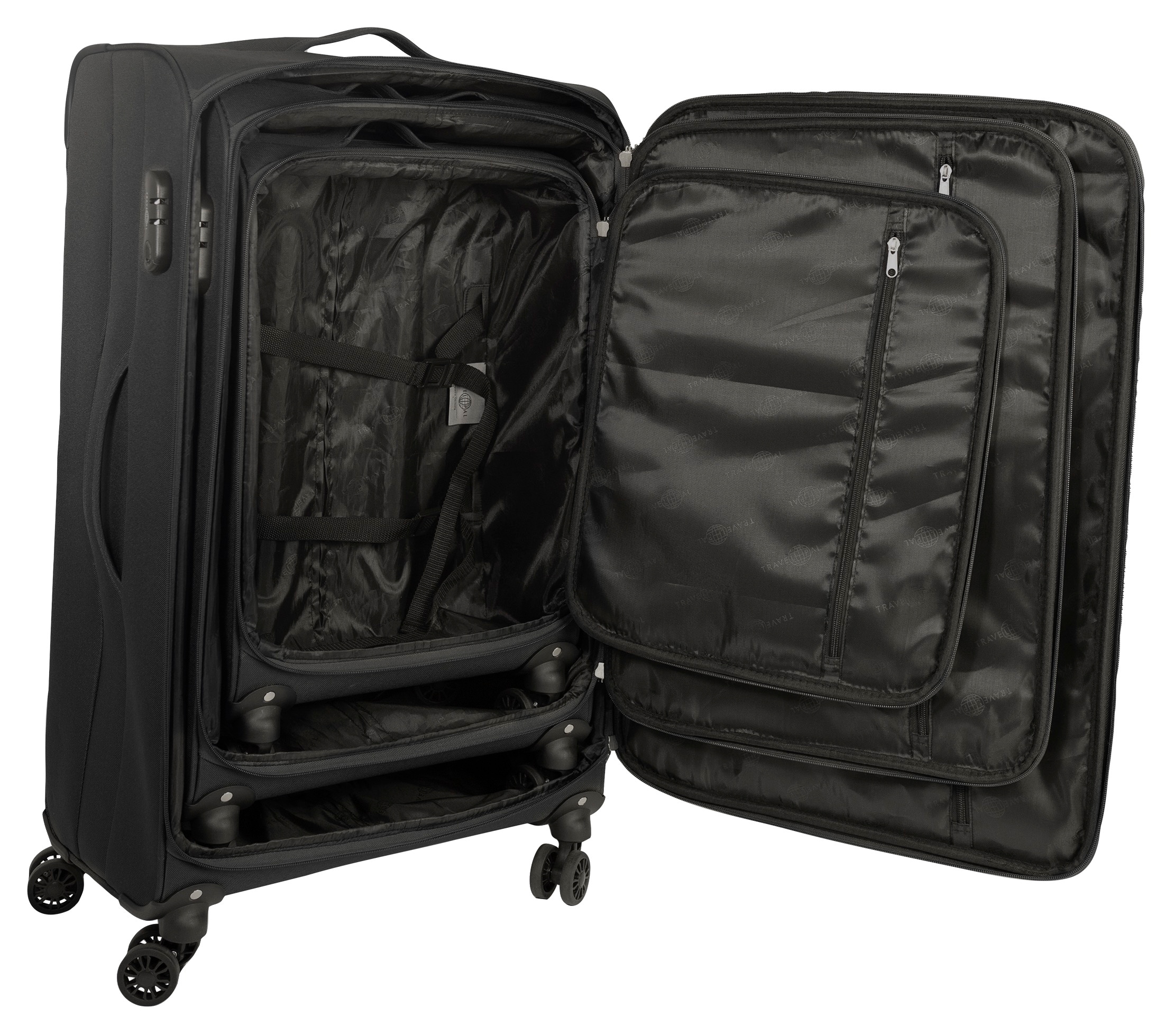 - Koffer mit 360°-Rollen, Kreuzspanngurt und Reissverschluss-Fächern